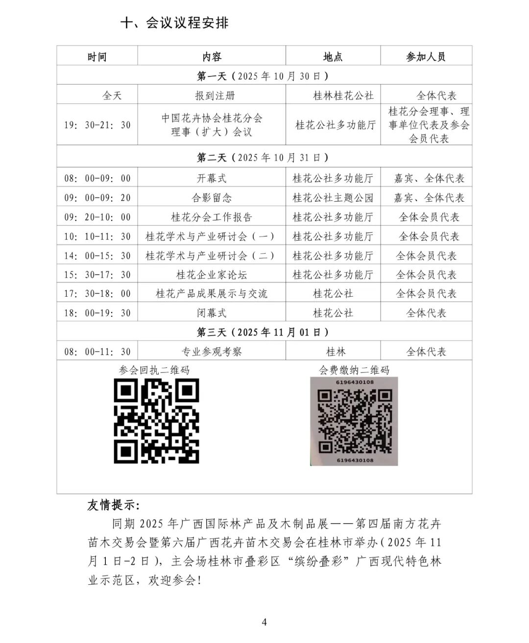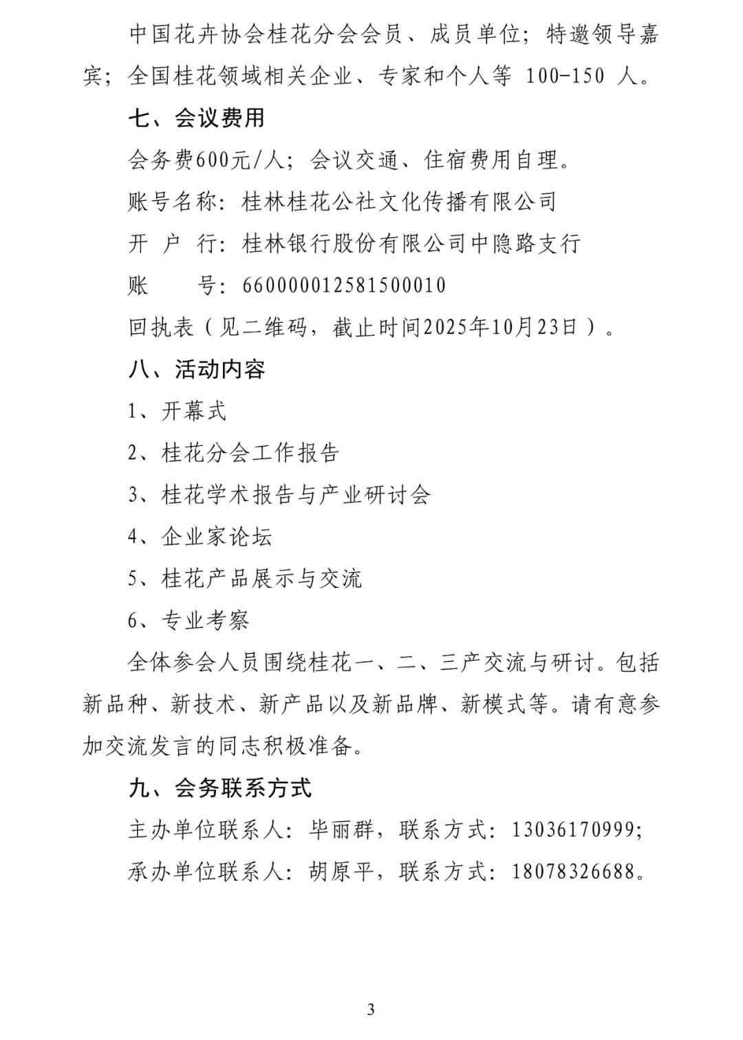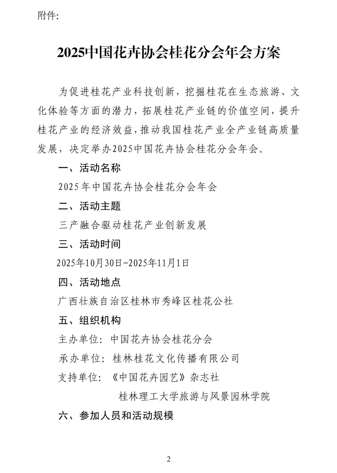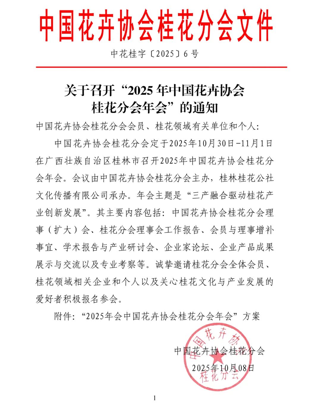 为促进桂花产业科技创新,挖掘桂花在生态旅游、文化体验等方面的潜力,拓展和提升桂花产业链的价值空间和经济效益,中国花卉协会桂花分会将于10月30日至11月1日在广西桂林举办2025年年会,邀请分会会员、桂花领域相关企业和个人,以及关心桂花文化与产业发展的爱好者们参会,围绕桂花新品种、新技术、新产品和新模式等进行研讨交流,共同推动我国桂花产业全产业链高质量发展。 2025年中国花卉协会桂花分会年会的主题为“三产融合驱动桂花产业创新发展”,由中国花卉协会桂花分会主办,桂林桂花公社文化传播有限公司承办。活动主要内容包括:中国花卉协会桂花分会理事(扩大)会、桂花分会理事会工作报告、会员与理事增补事宜、学术报告与产业研讨会、企业家论坛、企业产品成果展示与交流、专业考察等。 桂花是我国传统名花,具有悠久的栽培历史和文化,在园林绿化、美化、香化中发挥了举足轻重的作用。2024年,我国桂花产业展现出强劲的发展动力,桂花种植面积约125万亩;育种繁育进程加快,品种由传统的几十个发展到200多个;综合产值突破180亿元,年均增长率达12%。桂花产业在由传统单一生产向全产业链开发转型、由数量扩张向高质量发展转型的进程中取得了长足发展。