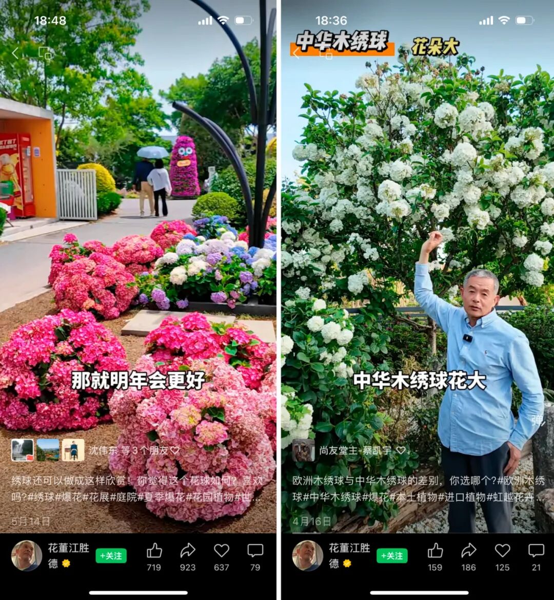 2024年9月23日,第二十二届中国昆明国际花卉展刚刚结束,许多行业伙伴惊喜地发现,由虹越花卉股份有限公司董事长江胜德倾力打造的个人IP账号“花董江胜德”在微信视频号正式上线。他从专业角度,全面、详细地介绍了昆明花展上的亮点和趋势,连续3天更新了花展相关视频,在业内引起广泛关注。后来,随着视频的持续更新,丰富的内容、明晰的观点,加之独特的个人风格,吸引了越来越多的粉丝。截至今年9月中旬,他在视频号、抖音、小红书上的粉丝量已超10万人。 出镜——勇敢迈出第一步 在各大社交媒体平台,与花卉植物和园艺相关的IP账号很多。他们中有的专注于野生植物科普,有的专注于商品花卉直播带货,还有不少兼顾内容输出与带货。然而,像江胜德一样,本身是规模化花卉经营企业的创始人,又专门运营以内容输出为主的个人IP并不多见。 作为国内较早深耕家庭园艺市场的资深从业者,江胜德深知拥抱短视频和直播时代的重要性。家庭园艺市场的快速增长需要更多的线上科普与推广。他关注了很多著名企业家的账号,在他看来,其他行业可能存在一定的技术壁垒,大众不一定都懂,但花卉作为一种美丽的事物,自带兴趣流量,大众接受起来相对比较容易。 从决定做视频号开始,江胜德就下定决心一定要自己出镜来讲,否则从平台规则来看,很难获得流量。对于一向低调的江胜德而言,出镜是个很艰难的决定。用他的话来说,做这个决定的艰难程度可以和他当年辞去体制内工作下海经商并列。 ▲处女作 去年9月初,他决定开始上线视频号后,团队的小伙伴一直在为此认真做准备。在大家仍觉得条件不具备、不充足的情况下,还是江胜德自己下定决心发出了第一条视频。“正好赶上昆明花展这个契机,我举着手机就开播了,周边声音嘈杂,光线也不好,关键是走出第一步,不管美丑,先发了再说。结果第一条视频收获了很多点赞和好评,业内朋友热心帮忙,平台也很给力,自己也厚着脸皮发朋友圈到处去推,启动还是顺利的。”江胜德回忆说。 对于要讲什么内容,江胜德早就心中有数。不过最初,他还不清楚平台观众到底喜欢什么。有些他自认为好的内容,要么观众看不懂,要么大家不感兴趣,一定要经过互动,才能慢慢抓住流量密码。“既然决定做了,就要努力试试看,向网络大V们学习,总归能摸索出适合自己的一路来。”江胜德说。 随着一条条视频的上线,江胜德也逐渐在镜头前找到了状态,展示真实的自己。从最初认认真真写稿、改稿,一对上镜头就紧张,一定要使用提词器,到今年2月,他已经不再使用提词器,改为内容随播随讲,想到什么就讲什么。专业加持,观点独特,态度真诚,金句频出,让越来越多的观众通过短视频认识了这位虹越的“花董”。每天翻翻他新出的视频,找找自己感兴趣的品种,成为很多花友粉丝的日常。 目前IP运营团队一共有3位成员,江胜德负责内容,另外两位分别负责剪辑和整体运营。视频以日更为主,特殊情况下会减少更新频率。粉丝量的初期增长主要来自业内人士和熟悉虹越品牌的花友,随着一些爆款视频的推出,后来普通爱花人士的粉丝数量增长明显。目前3个平台账号粉丝量均趋于稳定增长的状态。 以内容输出为核心 “花董江胜德”定位在内容输出平台,做有营养、有深度、受欢迎的内容,核心是围绕植物品种的推广和应用做科普。这既能为虹越品牌赋能,扩大品牌影响力,也是江胜德最感兴趣、最擅长的领域。 在网络上,一些园艺达人在带货的同时会做内容科普,主要是介绍某一品种的优点,如何种植,以及养护的细节和要点。与园艺达人不同的是,同样是讲植物品种,江胜德更多的是从应用或产业的宏观角度来介绍。他的角度和观点从全网来看都非常少见,以其独特性和新颖性引起了很多人的兴趣。而且同样是讲一个新品种,由于不受带货限制,江胜德不仅要讲它的优点,还会讲缺点,让消费者能够全面地认识该品种。从推出效果来看,优缺点介绍得比较全面,或者拥有独到观点与见解的视频,往往观看量都较高。 在江胜德推出的视频中,较早火爆的一条是“中国本土植物——中华木绣球”。视频里,在他自家院里已种植了6年的一株独杆中华木绣球正值爆花状态,瞬间就抓住了花友的眼球。接着听他的介绍,观众会了解到中华木绣球作为中国本土植物的特点就是爆花、花大,古代被称为“斗球”,之所以以前未被广泛应用,主要是其不易繁殖造成的。对于如今的花友来说,中华木绣球有个缺点是有的花朵还没开就枯萎了。他告诉大家,在长三角地区种植中华木绣球,夏、秋、冬季开始有的少量花苞,一定要打掉,否则会影响它春天的爆花能力。 这条视频引起了许多网友的关注和讨论,不少人表示自己有买到“盗版”的经历。为此,江胜德又相继推出了“被调包的中华木绣球”和“如何与琼花区分”两个视频,使花友进一步了解到,因为价格差距大,市场上很长一段时间里,商家为了利益,用琼花来代替中华木绣球销售。而不开花的中华木绣球和琼花非常像,普通消费者很难区分,容易上当。中华木绣球系列的视频引起了许多花友共鸣,也带来了一大波流量。 另一条令人印象深刻的视频是“植物围墙——风车茉莉”,视频号收获1500多个赞,抖音号收获2000多个赞。这条视频让很多人都“种草”了风车茉莉。出境的“明星”植物同样来自江胜德的