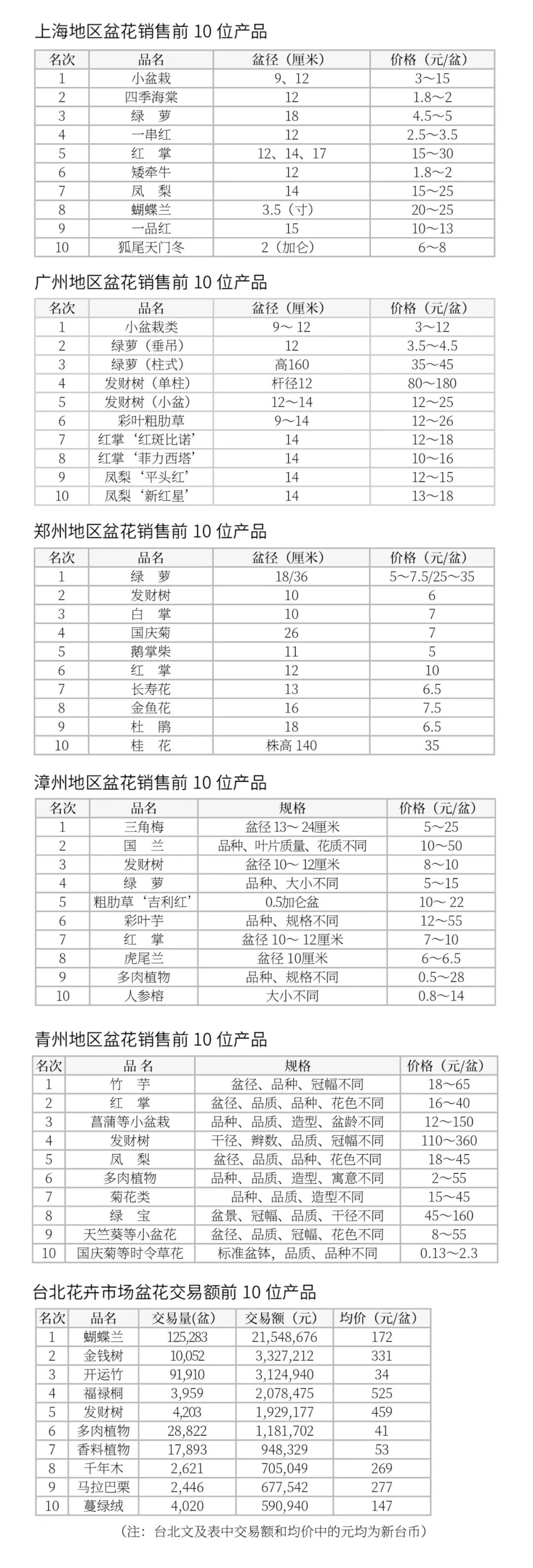 9月,在教师节、国庆节、中秋节消费需求的拉动下,盆花市场开始进入销售旺季。 上海 9月是盆花市场传统小旺季,开学季叠加国庆、中秋双节效应,市场行情较好。 受高温影响,一些草花产品质量有所下降,供应量受到一定制约,但需求量同样萎缩,价格在低位运行。矮牵牛、四季海棠、百日草等售价2元/盆。一串红、佛甲草等在中下旬出现缺货,价格上涨。一串红由2.5元/盆涨至3.5元/盆,佛甲草由10元/盘涨至15元/盘。 本地产大型绿植受高温影响,品质下降,销量较往年同期明显下降,价格环比稳定。杆径8厘米的幸福树售价200元/盆,杆径6厘米的绿宝售价130元/盆,株高1.2米的天堂鸟售价55元/盆。中小型绿植以绿萝、吊兰、竹芋等为主,需求不太旺盛,价格环比稳定。 在室内开花植物中,租摆常用的红掌、凤梨、蝴蝶兰等销量较好。但蝴蝶兰家庭消费、礼品消费需求萎缩明显,仅靠租摆换花,市场整体呈现同比量缩价稳的态势。 一品红的节日用花需求萎缩,价格下滑,由上旬的13元/盆将至下旬的10元/盆。狐尾天门冬上市量大增,价格大幅回落,2加仑盆产品价格由去年同期的20元/盆降至6~8元/盆,已基本接近成本价。 (上海鲜花港 杨鹏) 广州 9月,中秋节、教师节、国庆节促进了盆花的销售,尤其观花盆栽市场需求相对较大。红掌较畅销品种有‘红斑比诺’‘红成功’‘菲力西塔’‘密西根’等,价格稳中有升。凤梨主销品种有‘新红星’‘平头红’‘白雪公主’等,价格与去年同期持平。三角梅、龙船花、姜荷花等因景观用花量大,受到市场欢迎。蝴蝶兰上市品种较多,白色、粉色、黄色等淡雅色系品种销量不错,小花型产品也受市场欢迎。杂交兰、国兰占有一定的市场份额。国庆期间市政用花量较大,优质草本盆花价格上涨。观叶盆栽中发财树、金钱树、白掌、绿萝、粗肋草、竹芋等销量相对较大,但因上市量大,价格较往年同期下跌。组合盆栽、创意盆栽、网红植物等时尚盆花,受到消费者的喜爱。 (广东省农业科学院环境园艺研究所 王代容) 郑州 9月,国庆渐近,运输费用率先上涨,牵动盆花价格随之起伏。月底台风来袭,广州及周边种植基地运力吃紧,加之国庆货品提价,致使“车贵花亦贵”。花卉租摆业务在节前迎来爆发。上旬,本地国庆菊大量登场,其中球菊、多头菊售价5~8元/盆,成为商圈、景点造景摆花的热门之选。 观叶类 盆径18厘米的绿萝售价5~7.5元/盆,环比上涨6.8%。盆径36厘米的绿萝售价25~35元/盆,环比上涨9.1%。盆径10厘米的发财树均价6元/盆,环比保持稳定。盆径11厘米的鹅掌柴(招财树)均价5元/盆,环比保持稳定。 观花类 盆径10厘米的白掌均价7元/盆,环比上涨16.7%。盆径26厘米的国庆菊均价7元/盆,球菊、多头菊因品种不同,每盆价格相差1元以内,同比保持稳定。盆径12厘米的红掌均价10元/盆,环比保持稳定。盆径13厘米的长寿花均价6.5元/盆,环比上涨18.2%。盆径16厘米的金鱼花均价7.5元/盆,环比下降6.3%。盆径18厘米的杜鹃花均价6.5元/盆,环比上涨8%。株高1.4米的桂花均价35元/盆,同比价格保持稳定。 (河南陈砦花卉双桥基地 徐一诺) 漳州 9月,随着佳节将近,漳州花卉交易市场人气渐盛。观叶盆栽、国兰销量增加。 盆栽植物 本月货架上仍以观叶绿植为主。三角梅销量较上月略有上涨,老品种售价稳定在5~25元/盆不等,新品种价格在12~120元/盆不等。粗肋草‘吉利红’10~12元/盆,红掌7~10元/盆,高60~70厘米的虎尾兰4株组合6~6.5元/盆。干径10厘米、株高1.2米的发财树100~120元/盆,小盆五辫发财树8~9元/盆。彩叶芋批发价12~120元/盆,沙漠玫瑰5.5~36元/盆,0.4加仑盆的绿宝16元/盆。 兰花 国兰线上线下总体销量有所上涨。建兰‘青山王泉’‘东方红荷’‘富山奇蝶’20~30元/盆。春兰‘大富贵’20~30元/盆,‘宋梅’25~40元/盆,‘花开富贵’30~50元/盆。墨兰‘企黑’‘报岁兰’10~15元/盆。蝴蝶兰价格稳定,中小型的双梗花18~20.8元/株,大花型单梗25元/株。 多肉植物 销量较上月有所增加,价格略有上涨。普货55~60元/件,组盆35装65元/件、15装75元/件。 (福建漳州市花卉协会 林婵娟) 青州 9月,节日和展会的溢价收窄,花卉销售进入微利时代。在青州花卉博览交易会的拉动下,市场销售现“翘尾”,量价明显上涨,环比上涨15%~20%。竹芋、红掌、凤梨、彩叶芋、多肉植物、蝴蝶兰、菊花等盆花量价上涨8%。菖蒲、荷花、观音竹、天竺葵、矾根、苔藓、球菊等盆花量价环比上涨5%~10%;国庆菊、矮牵牛、一串红、孔雀草、太阳花、百日草、彩叶草、粉黛乱子草、鼠尾草、五色草等时令草花走货量环比上涨20%~30%。 观叶类 盆径15~30厘米竹芋20~65元/盆。干径8~15厘米、株高1.5~2.5米的发财树(含三辫、五辫、盆景类)110~360元/盆。盆径5~20厘米多肉植物2~55元/盆。干径6~15厘米绿宝45~155元/盆。绿萝11.5~65元/盆。菖蒲、彩叶芋、苔藓、蕨类植物、观音竹等小盆栽12~150元/盆。白掌、矾根、碧玉、袖珍椰子等小绿植10~25元/盆。金钱树45~135元/盆,龙血树30~280元/盆,干径10~30厘米的幸福树150~480元/盆。龟背竹、栀子花、清香木、金钻、平安树、散尾葵、巴西木、非洲茉莉、富贵竹、桂花盆景、榕树盆景、三角梅盆景、黄杨盆景、黑松盆景、南天竹盆景、罗汉松盆景等盆花15~550元/盆。 观花类 盆径12~19厘米的红掌16~40元/盆,凤梨18~45元/盆。菊花类5~45元/盆,蝴蝶兰16~28元/株。天竺葵、垂吊牵牛、绣球、丽格海棠、