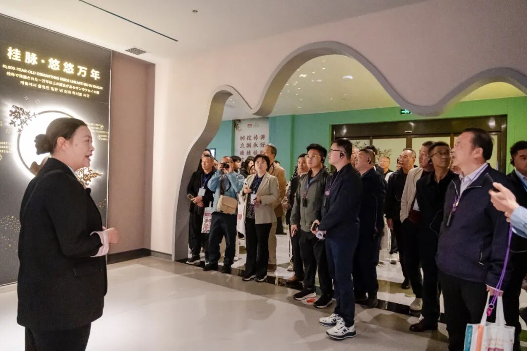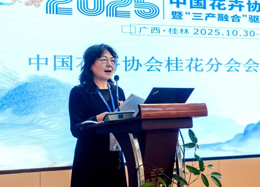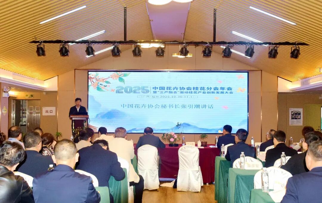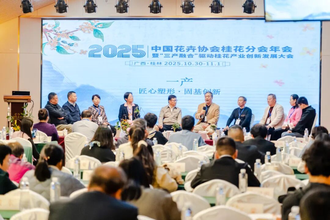 ▲学术与产业研讨会演讲嘉宾 ▲企业家论坛 本次活动由中国花卉协会桂花分会主办,桂林桂花公社文化传播有限公司承办,桂林市顺昌食品有限公司、桂林市金粟食品有限公司、桂林金禾农业发展有限公司、桂林大迈生物科技有限公司、桂林阳发食品有限公司、桂林漓江茶厂有限公司协办,《中国花卉园艺》杂志社和桂林理工大学旅游与风景园林学院支持。 ▲参会代表合影 3天的年会是会员们一年一度的大聚会,也是产业科研、信息交流的重要平台。本次活动亮点纷呈、成果丰硕,在组织形式、内容深度与产业联动等方面都实现了重要突破。 1. 产学研深度融合,发布权威行业报告 中国花卉协会桂花分会与《中国花卉园艺》杂志社合作,首次策划出版《中国桂花》专题,收录22篇专业文章,系统梳理全国桂花产业发展现状,涵盖主要产区调研报告及一二三产典型案例,为行业提供权威参考与发展指南。 2. 多媒体赋能,打造桂花文化IP 由中国花卉协会桂花分会领导牵头,联合华中农业大学、咸宁市政府等多方力量,共同摄制《桂香雅韵》系列视频20余部,内容覆盖桂花全产业链与公园管理实践,通过会场展播与新媒体矩阵联动,显著提升桂花文化传播力。 3. 产品与技术双驱动,凸显新质生产力 年会现场展出来自咸宁市及桂花公社等企业的近80种桂花产品,展现产业多元化成果。学术报告聚焦产业瓶颈,推动新品种、新技术与新工艺的应用,以创新手段提升效率、降低成本,赋能产业升级。 ▲桂花香氛及食品展示 4. 强化企业家角色,推动跨界融合创新 年会首次设立企业家论坛,邀请跨行业企业家参与,围绕桂花产业优势与关键环节展开深度交流,激发创新思路,为产业融合与业态拓展注入新动力。 5. 创新办会机制,激发企业活力 本届年会首次由企业自主承办、6家企业共同协办,体现行业主体性的提升,展现企业在推动桂花产业发展中的积极角色与责任担当。 ▲桂花公社 6. 联动行业盛会,拓展专业视野 与“第四届南方花木交易会”相继举办,代表可参与多场专业考察与交流活动,拓宽行业认知,促进资源对接与跨界合作。 ▲第四届南方苗木花卉交易会 7. 媒体聚焦升温,助力产业“出圈” 在桂花丰年的背景下,各级官方媒体与自媒体广泛报道,有效提升公众对桂花产品的认知度,推动桂花产品走进千家万户,产业影响力持续扩大。