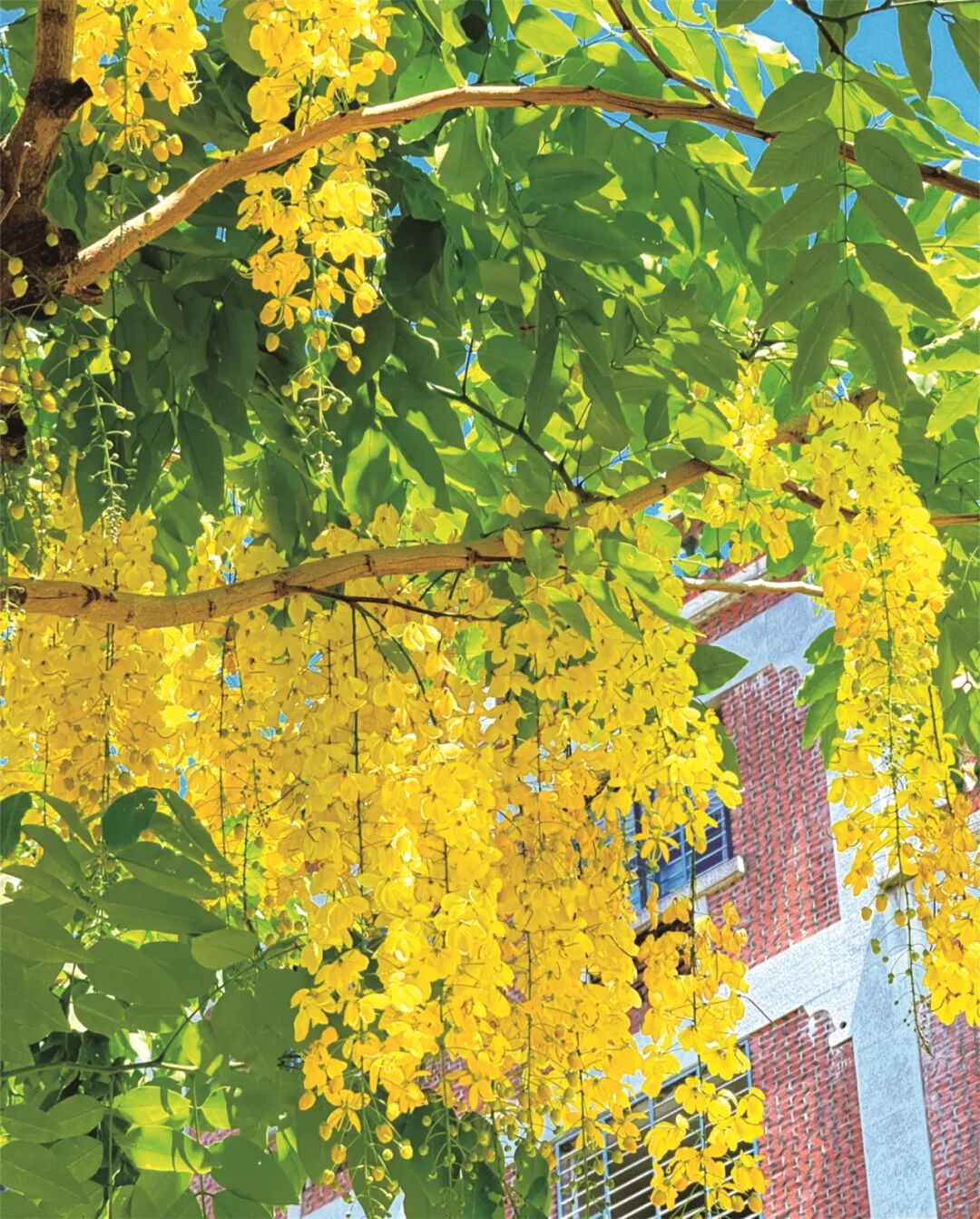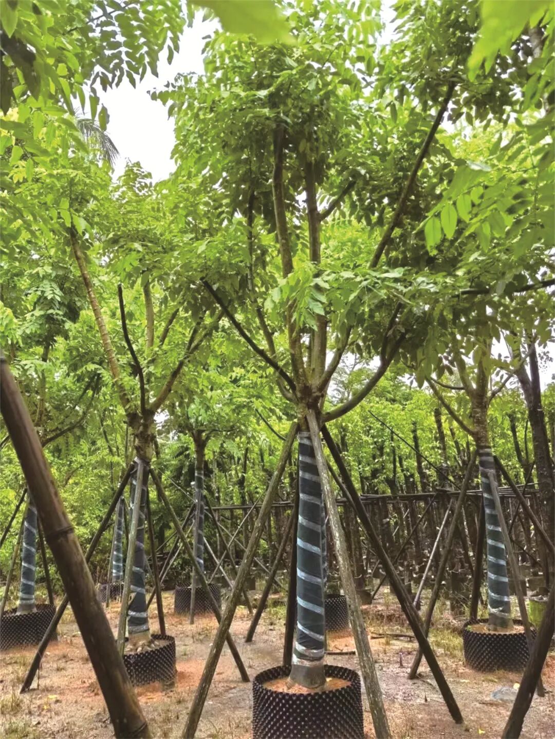 腊肠树(Cassia fistula)为豆科腊肠属落叶乔木,别名阿勃勒、牛角树、波斯皂荚、长果子树等。原产北美洲大陆、印度、缅甸和斯里兰卡,在我国南部和西南部各省均有栽培,是南方常见的庭园观赏树木。盛花时,全树枝挂金黄色的花串,款款下垂,临风摇曳,花瓣随风飘落纷飞,似黄金雨,十分美观。腊肠树不但花多而美丽,果实也很奇特,长条形、黑褐色的荚果像一根根腊肠挂在树枝上,常用作行道树或园林景观树。 ▲漳州芝山路的腊肠树行道树 腊肠树为喜温树种,生长适温23℃~32℃,能耐最低温度0℃,苗期在有霜冻害地区不能生长;性喜光,抗风性强,耐荫蔽;能耐干旱,亦能耐水湿,但忌积水地;对土壤的适应性颇强,喜生长在湿润肥沃排水良好的中性砂质壤土中,在干燥瘠薄的土壤中也能生长。 繁殖方法 腊肠树常用繁殖方法有种子繁殖、扦插繁殖,适宜在春、秋季进行。 种子繁殖 腊肠树果实成熟期9~11月,待荚果由绿变褐且干燥时采集。剥开荚果取出种子,清除杂质,晾干后储存于阴凉干燥处。储藏的种子常在春季播种,新鲜的种子可在秋季播种。腊肠树种子非常硬实,要先进行破皮处理,以提高发芽率。储藏的种子用80℃的热水浸泡48小时后及时播种,新鲜种子用室温清水浸泡12小时即可播种。采用规格10厘米×14厘米的黑色薄膜袋育苗,基质采用疏松透气的沙壤土,也可以用园土︰河沙︰腐叶土=1︰1︰1的混合基质。为预防苗木发生病害,基质在装入育苗袋前,先用生石灰消毒。播种前用5克/升的高锰酸钾水溶液消毒苗床。点播时,先将基质淋透水,在基质中间挖一孔,孔径略大于种子、深2~3厘米,再把种子放进孔中,覆土2~3厘米,轻轻压实。保持苗床土壤湿润,避免积水。种子播完后,用竹片搭好拱棚,上面覆盖塑料薄膜或稻草保湿,直至移栽。 ▲腊肠树的花 扦插繁殖 选择春季3~4月或秋季9~10月进行。在3~5年生健康母树上采集插穗,选用当年生半木质化枝条,直径0.5~1厘米。插穗剪取长度10~15厘米,保留2~3个芽点。上切口平剪,距芽点1厘米;下切口45°角斜剪,保留顶端1~2片叶,去除其余叶片。扦插基质为珍珠岩︰蛭石︰泥炭土=1︰1︰1,也可是河沙︰腐殖土=2︰1,基质先用0.3%高锰酸钾溶液浇透或高温蒸汽消毒。插条直接插入苗床,轻压基质,使其与基质紧密接触。扦插后,保持环境稍阴、基质潮湿,空气相对湿度80%~90%,温度25℃±3℃。前期遮光70%~80%,生根后逐渐增加光照至50%遮光。每天早晚各通风1次,每次30分钟。一般插穗扦插后30~45天即可生根成活。当新根长至3~5厘米,新稍长5~10厘米时可移栽。 栽培管理 苗期管理 当种子长出小芽时,把塑料薄膜去掉,换用50%的遮光网覆盖,这样利于通风和透光,并注意淋水,以促进小苗正常生长。当小苗长出1~2对叶片时去掉遮光网,让苗木在自然光照条件下生长。小苗长出2~4片叶后,根据其生长情况及时间苗,保留健壮苗。每周可施用1次5克/毫升复合肥水溶液,施肥应在上午进行,下午再淋水洗苗。当苗木生长到20~30厘米高时,移栽至大田或容器,注意带土移栽以避免伤根。 移栽定植 苗木移栽定植成功的关键在于减少根系损伤、促进恢复生长及适应新环境。一般选择在春季3~4月或雨季初期(南方5~6月),气温稳定在15℃时进行,避免高温干旱或严寒季节。提前1~2个月对原地苗木断根,在苗木基部挖环形沟,注意保留土球直径,促进新根萌发。剪去全株1/3~1/2的枝叶,以减少蒸腾,去除病弱枝、交叉枝。土球直径为苗木胸径的8~10倍,深度为直径的2/3,用草绳或无纺布包裹固定。定植地选择土质肥沃、不积水、排灌方便的沙质壤土,株行距根据地形和栽培目的而定,一般为2米×2米,种植穴规格比土球大50%~100%。例如,土球直径1米,种植穴宽1.5~2米、深1.2米。每穴施腐熟农家肥3~5千克或复合肥0.25千克,与表土混合作基肥。定植最好选在阴雨天,苗栽植好、覆土后轻轻往上提,使根系舒展,踏实土壤,填土应略高于地面5~10厘米,以防积水,晴天定植应浇足定根水。用三角支架或缆风绳固定树干,防止倒伏。 ▲腊肠树高大挺拔 肥水管理 苗木成活后第1年,每月施用1次稀薄液肥,如腐熟饼肥水或氮磷钾均衡复合肥。2~3年生苗木,则在春季的3~4月施用尿素等高氮肥,以促枝叶生长,在开花前的5月施用磷酸二氢钾等高磷钾肥,以促进花芽分化,开花后的9~10月施用有机肥和复合肥,以恢复树势。成年树在每年春秋两季各松土除草1次,同时环状沟施1~2次有机肥,冬季可增施骨粉或草木灰。 整形修剪 幼树生长速度较快,树型会不甚整齐。当幼树长至高1米左右时,应及时立支撑架,保持树干直立。1~3年生幼树长至高1.5米左右,保留3~5个分布均匀的主枝,剪除竞争枝。4年生以上的成年树要及时疏枝,改善通风透光,去除病虫枝、交叉枝、内向枝,修剪过长枝回缩至健壮侧枝处,促进新枝生长。若树体过高,可截断主干顶端,促发侧枝。为提高观赏效果,修剪时间选择在花期过后,剪除残花穗,减少养分消耗。春季不宜修剪。一般培育3年生的实生苗,即可用于园林绿化。 ▲苗木用支架固定防止倒伏 病虫害防治 常见病害有根腐病、叶斑病、白粉病等,虫害有蚜虫、介壳虫、刺蛾、天牛、红蜘蛛等。 根腐病 苗木根部发黑腐烂,叶片发黄萎蔫,严重时整株枯死。病因主要是土壤积水、透气性差,或有镰刀菌、腐霉菌感染。发病初期,可用50%多菌灵800倍液或恶霉灵1500倍液灌根,严重时挖出病株,切除腐烂根,换土消毒后重新
