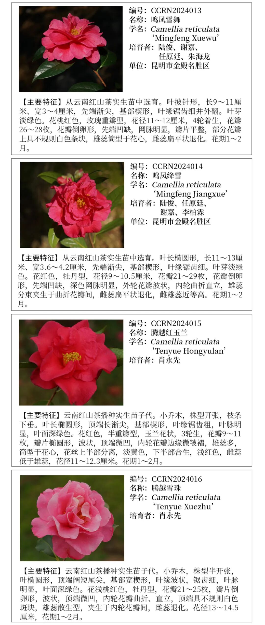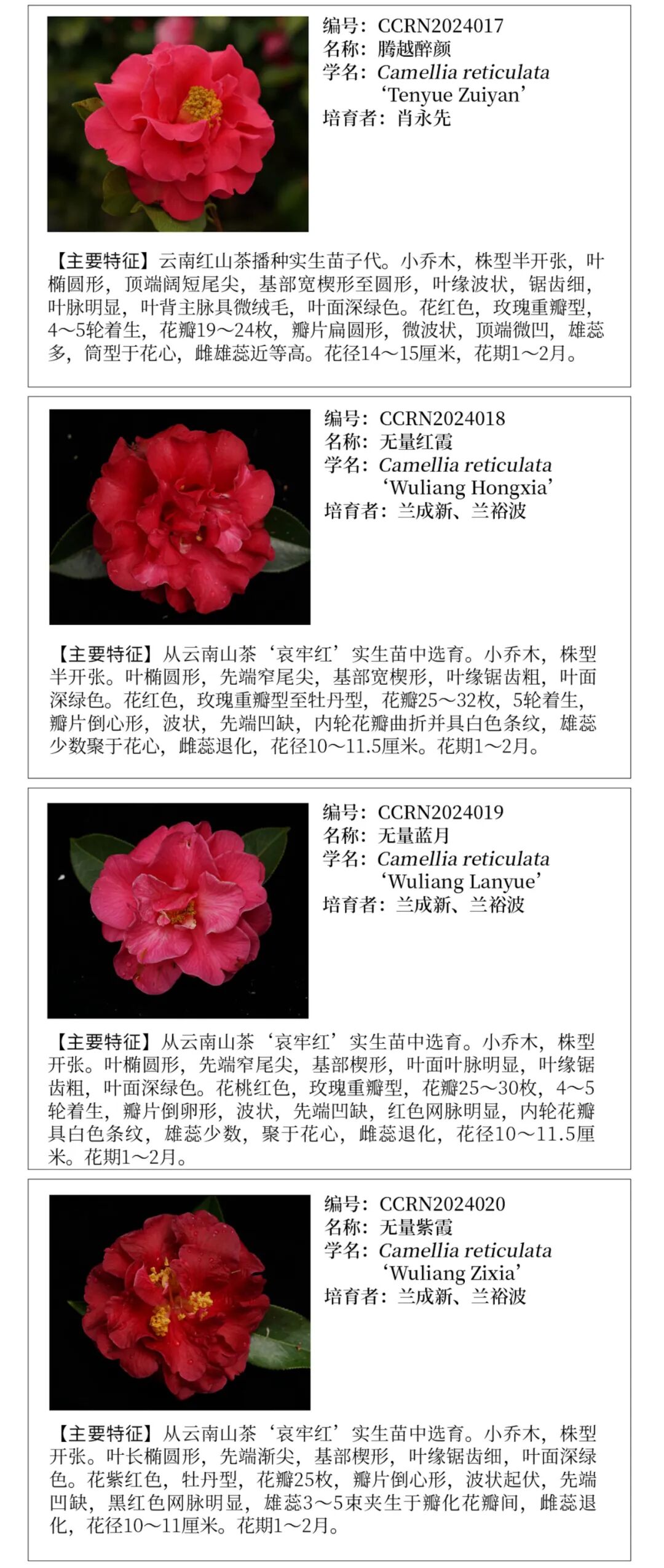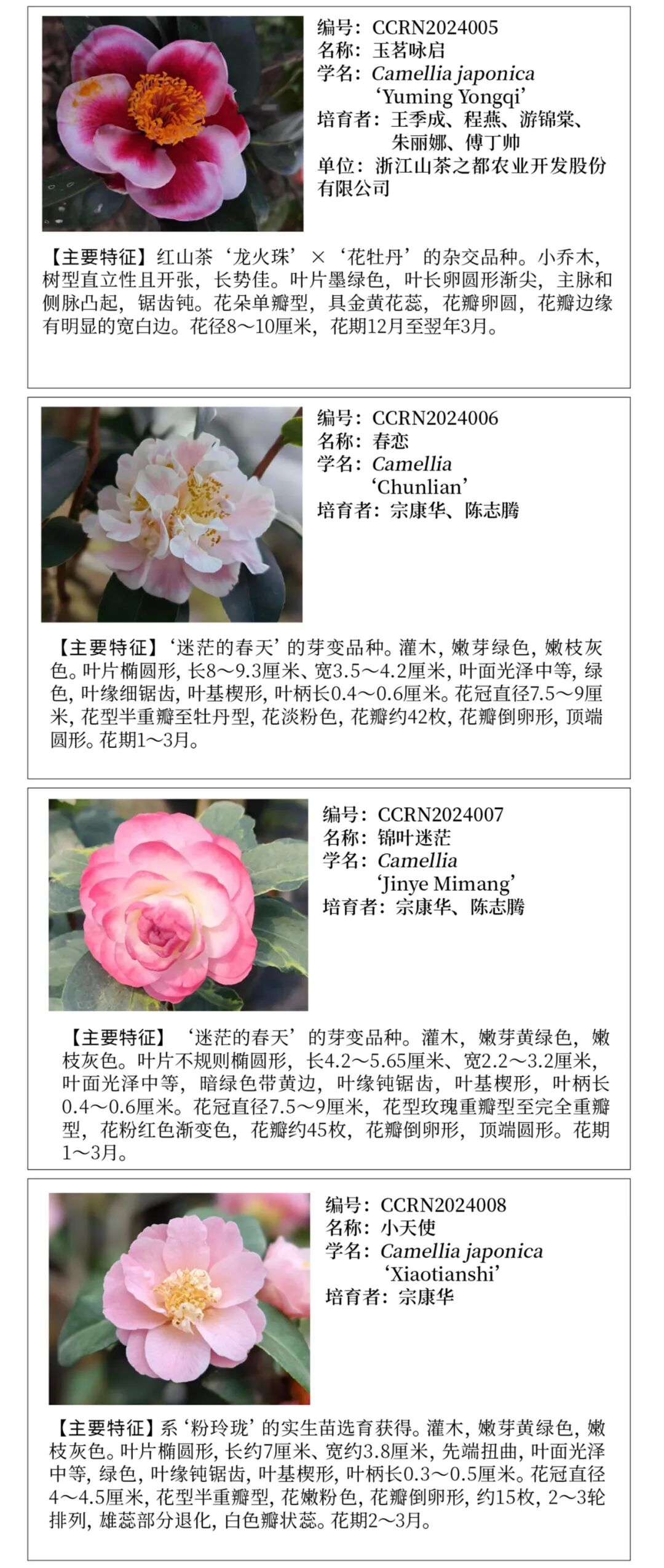 根据《中国花卉协会茶花分会茶花育种与新品种登录工作细则(试行)》,中国花卉协会茶花分会组织专家初审和育种与新品种登录专家委员会会议审议,现将评审通过的品种予以公示,公示期为2025年11月26日至2025年12月2日。 在公示期内,任何单位和个人如对公示的茶花品种有异议,可向中国花卉协会茶花分会秘书处提交书面意见。单位意见须加盖公章,个人意见须签署真实姓名、身份证号和联系电话。 电话:0579-82790195 邮箱:zhxchfh@163.com 中国花卉协会茶花分会 2025年11月26日 2024年度拟登录茶花新品种