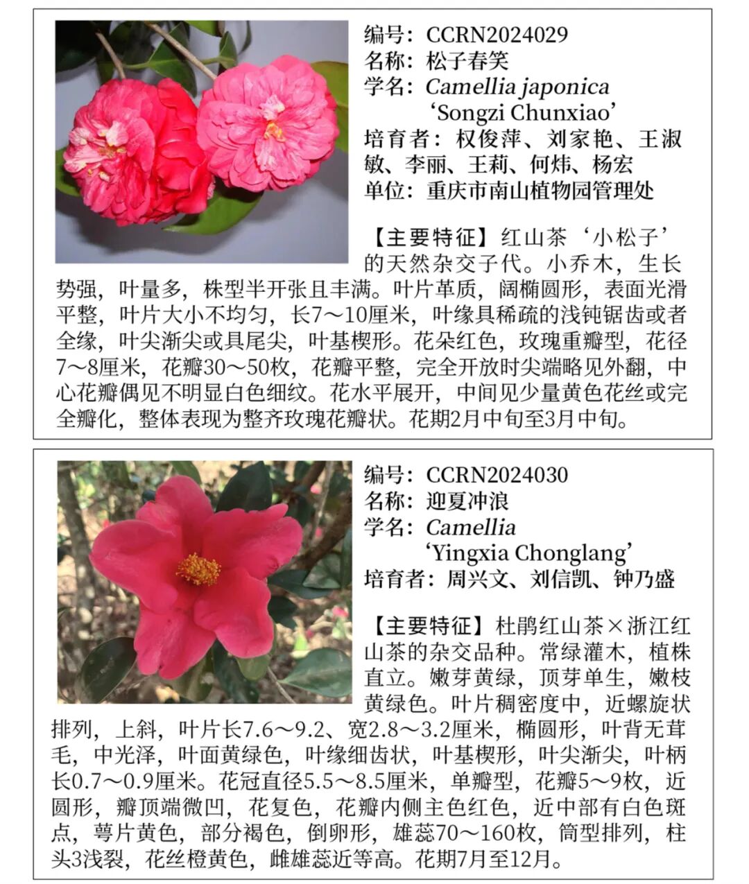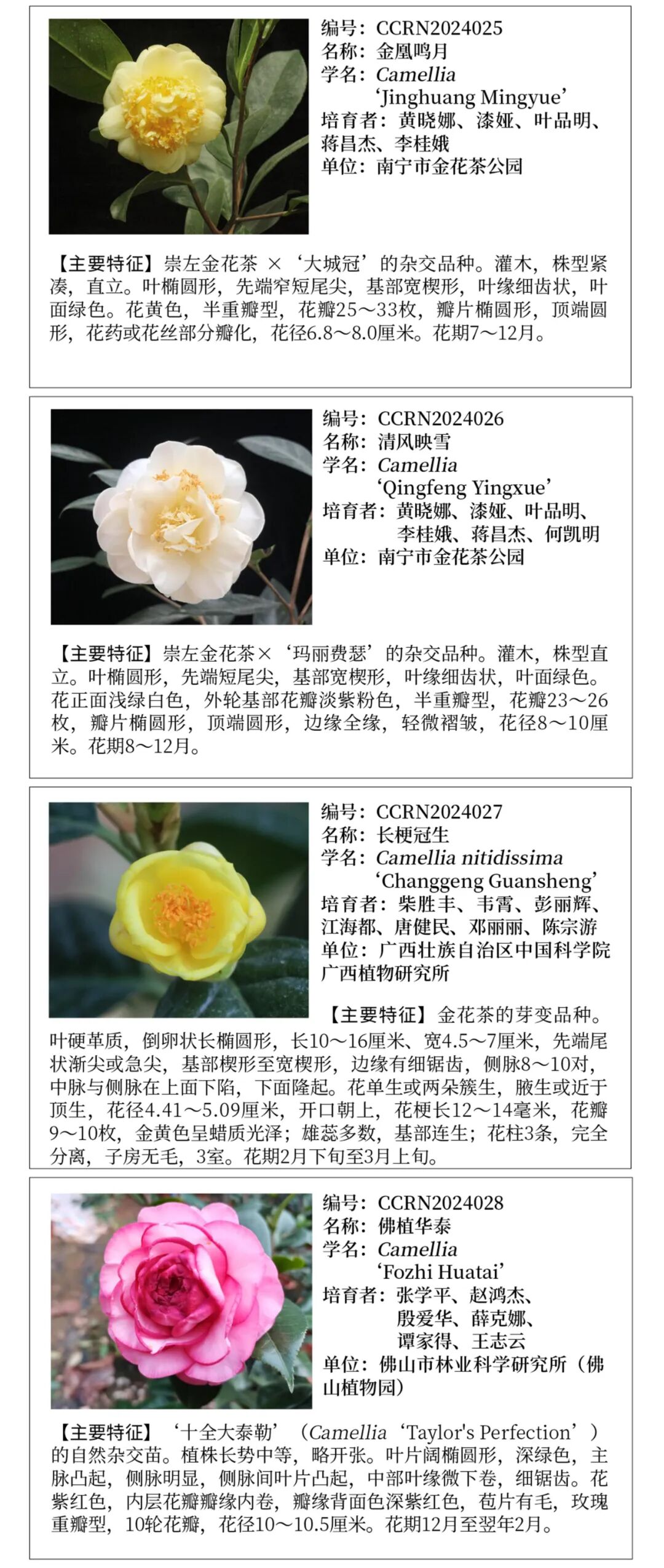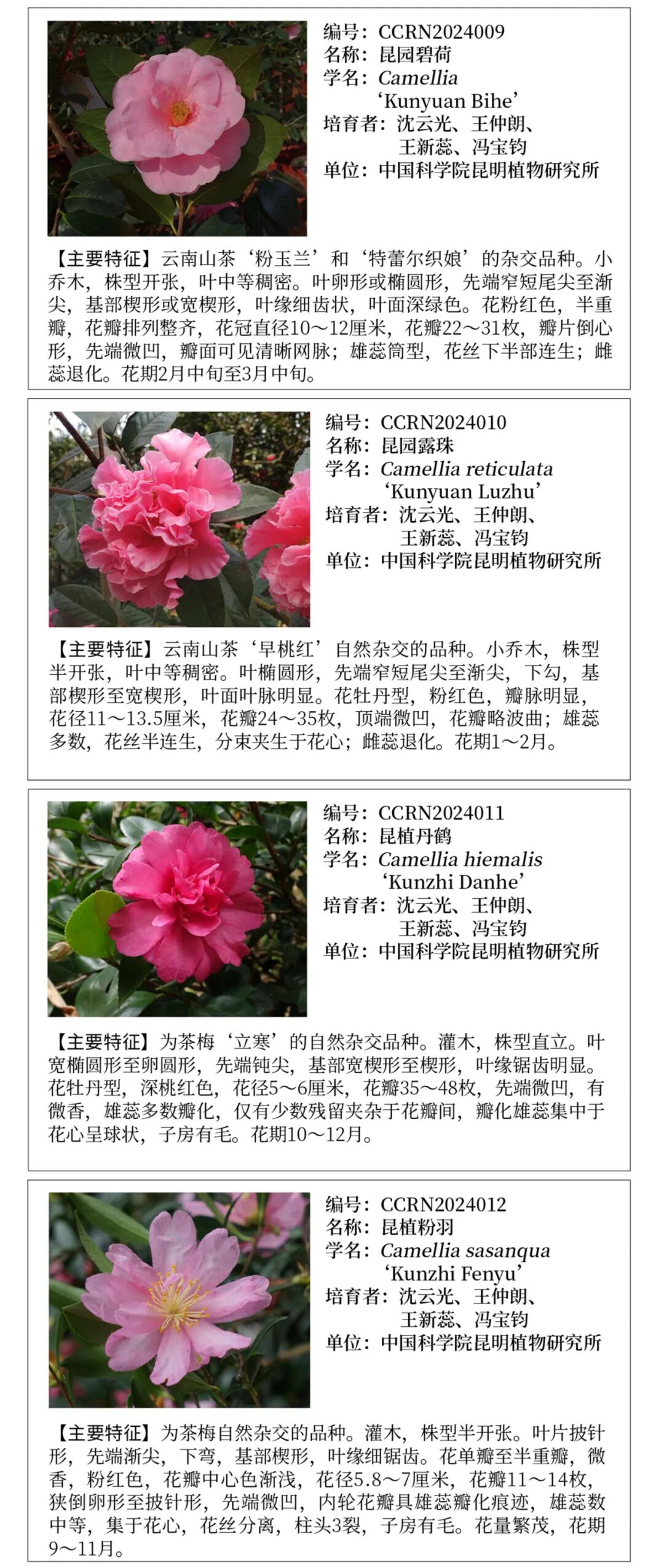 根据《中国花卉协会茶花分会茶花育种与新品种登录工作细则(试行)》,中国花卉协会茶花分会组织专家初审和育种与新品种登录专家委员会会议审议,现将评审通过的品种予以公示,公示期为2025年11月26日至2025年12月2日。 在公示期内,任何单位和个人如对公示的茶花品种有异议,可向中国花卉协会茶花分会秘书处提交书面意见。单位意见须加盖公章,个人意见须签署真实姓名、身份证号和联系电话。 电话:0579-82790195 邮箱:zhxchfh@163.com 中国花卉协会茶花分会 2025年11月26日 2024年度拟登录茶花新品种