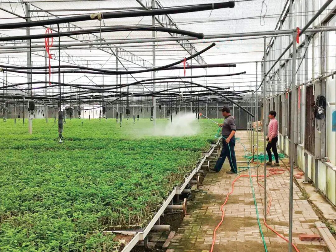摘要:苏北沿海地区中山杉育苗大部分采用露天遮阳网钢架设施和普通塑料薄膜大棚的传统育苗方式,造成中山杉扦插育苗成活率低(20%左右)。本文创新性地采用现代化全自动温室高床容器育苗技术,精确控制温度、湿度、光照等,通过优化基质配比,使中山杉扦插育苗成活率提升至80%以上。 关键词:沿海造林、温室高床容器、优化基质、成活率 中山杉在我国各地都有栽培,是园林绿化良种,已被列入沿海植树造林的首选树木之一,市场前景好。目前,中山杉育苗大都采用露天遮阳网钢架设施和普通的塑料薄膜大棚设施结合平地进行,条件相对比较简陋,扦插育苗成活率仅20%左右,达不到稳产增效的预期目标。同时市场上大部分中山杉育苗使用通用型基质土,培育成活率低,成长缓慢。本文通过在江苏省东台市弶港农场温棚进行中山杉容器育苗试验,总结在苏北沿海地区有效提高育苗成活率的中山杉容器育苗技术,以供参考。 扦插前准备 苗床准备 在温棚内搭建苗床,苗床距地面抬高1米、长2米、宽18米,面积36平方米。 苗床铺垫 在搭建好的苗床上,铺设保湿棉作为保水保温垫层,垫层厚度约4~6厘米,然后在垫层上依次摆放单个的无纺布营养土钵,钵内装满基质。扦插育苗基质组成为:草炭76%~84%、珍珠岩7%~9%、碳化砻糠5%~7%、蛭石3%~5%、控释肥1%~3%。 材料准备 磷酸二氢钾叶面肥、松脂酸铜(有效成分含量20%)、多菌灵、代森猛锌、萘乙酸、酒精、吡虫啉、高效氯氰菊酯、虫螨腈、啶虫脒、根康灵水溶肥料(10%SL)、强力生根壮苗剂、颗粒“锌”和“镁”微量元素水溶肥料。 基质准备 扦插前,将布质营养土钵浇透水,以保湿保温垫层下面出水为宜。注意浇水同扦插的间隔时间不宜太长,以免营养土钵再度干燥,造成基质营养的损耗。通常在扦插的前一天进行。 床面消毒 无纺布营养土钵基质消毒用多菌灵800倍液浇透后使用。 扦插 扦插时间 中山杉扦插通常在夏季的6月份或秋季的9月上旬进行。本次实验选择夏季扦插,于6月中旬至7月初进行。夏季扦插应在阴天、早晨和傍晚进行,尽量减少在扦插过程中的插穗失水。 选择插条 选取当年生半木质化健壮枝条,特别是基部色泽为淡黄白色或黄绿色且长度不低于20厘米的枝条。枝条剪下后及时在阴蔽处摊开放置,并定时洒水保湿。当天采下的插条尽量在当天扦插,若有剩余,夜间应放入室里加以保湿。 剪穗 用消毒过的剪刀,将阴干后的枝条剪成长6~8厘米的插穗,上剪口在节上方0.5~1厘米处平切,下剪口在节下方斜切。每50根插穗为一束,捆绑整齐。 扦插 将插穗快浸1500毫克/升萘乙酸溶液中20秒,然后用手指捏住插穗中部并将其插入基质中,扦插深度2~3厘米。每个无纺布营养土钵中扦插1根插穗。将基部2~3厘米长的枝段插入基质中,插后用大拇指适当压实基质,之后再喷水浇透。 扦插后管理 水分与湿度 水分管理是插条成活的关键。在扦插初期的20天内,经常间歇性喷雾洒水。插后20~40天内适当减少喷雾次数。40天后,插穗普遍生根,每天只在中午时适当喷雾。 ▲温室高床容器育苗 光照和温度 扦插后,夏季晴天盖好遮阳网,开天窗、排气扇等将温室内气温控制在35℃以下。温度过高还要喷雾降温。在插穗发根前,遮阴率75%~90%。全部插穗发根至50%插穗长出叶片后,逐步除去遮阳网。 病虫害防治 在扦插前对苗床消毒处理的基础上,交替使用多菌灵800倍液和代森锰锌600倍液,每隔3天喷1次,另外喷施20%松脂酸铜600倍液,每隔7~8天喷1次以预防病害。防治蚜虫可喷施吡虫啉和高效氯氰菊酯混合液200倍液,鳞翅目类幼虫喷施虫螨腈和啶虫脒混合液200倍液,每隔6~8天喷1次。 养分管理 插穗在愈伤组织形成到幼根长出后,喷施磷酸二氢钾1000倍液,每隔6~8天喷1次。在插穗根系大量形成后到移栽前,交替使用根康灵水溶肥料和强力生根壮根剂500倍液,每隔2~3天喷1次。喷施颗粒锌镁微量元素水溶肥料500倍液,每隔9~11天喷1次。 炼苗 扦插后60~70天,插穗根系已全部生长,长约5~7厘米,温室内的喷洒设备应暂停洒水,视苗床基质干湿情况采用手动洒水,进入壮根炼苗阶段,直至当年年底或次年春季全部完成出售或定植。 结论与讨论 环境优势 在温室中进行中山杉容器育苗,苗木生长环境具有明显优势,温度、湿度、光照更加可控,始终保持中山杉最佳生长环境。插条存活率80%以上,商品率90%以上,能达到预期生产效益,适合企业大规模订单生产,实现了稳产增效的目的。 ▲大苗容器移栽定植 高床培育特性 中山杉扦插育苗多在平地上扦插,当年扦插苗一般到第二年才能达到商品标准进行出售,扦插和移栽成活率比较低。高床容器育苗相比平地育苗,其茎叶生长旺盛、色泽浓绿、根须发达、抗逆能力较强,在出圃移栽或定植后,存活率可达90%以上。高床培育具有排水快、基质升温快、湿度易于控制等特点,有助于中山杉扦插苗快速生根,可在当年出售。同时,高床培育可以降低病虫害的发生率,提高中山杉的成活率和生长速度。 营养基质优势 基质的透气性、保水性及营养成分会影响插条的存活率。试验筛选适合中山杉扦插育苗的基质配比:草炭76%~84%、珍珠岩7%~9%、碳化砻糠5%~7%、蛭石3%~5%、控释肥1%~3%。 移植优势 使用高床无纺布营养土钵育苗,移栽时对苗木的根系不会产生任何损伤,而平地育苗在进行移植过程中,必然对其根部形成破坏。无纺布的营养土钵在定植后3个月以内