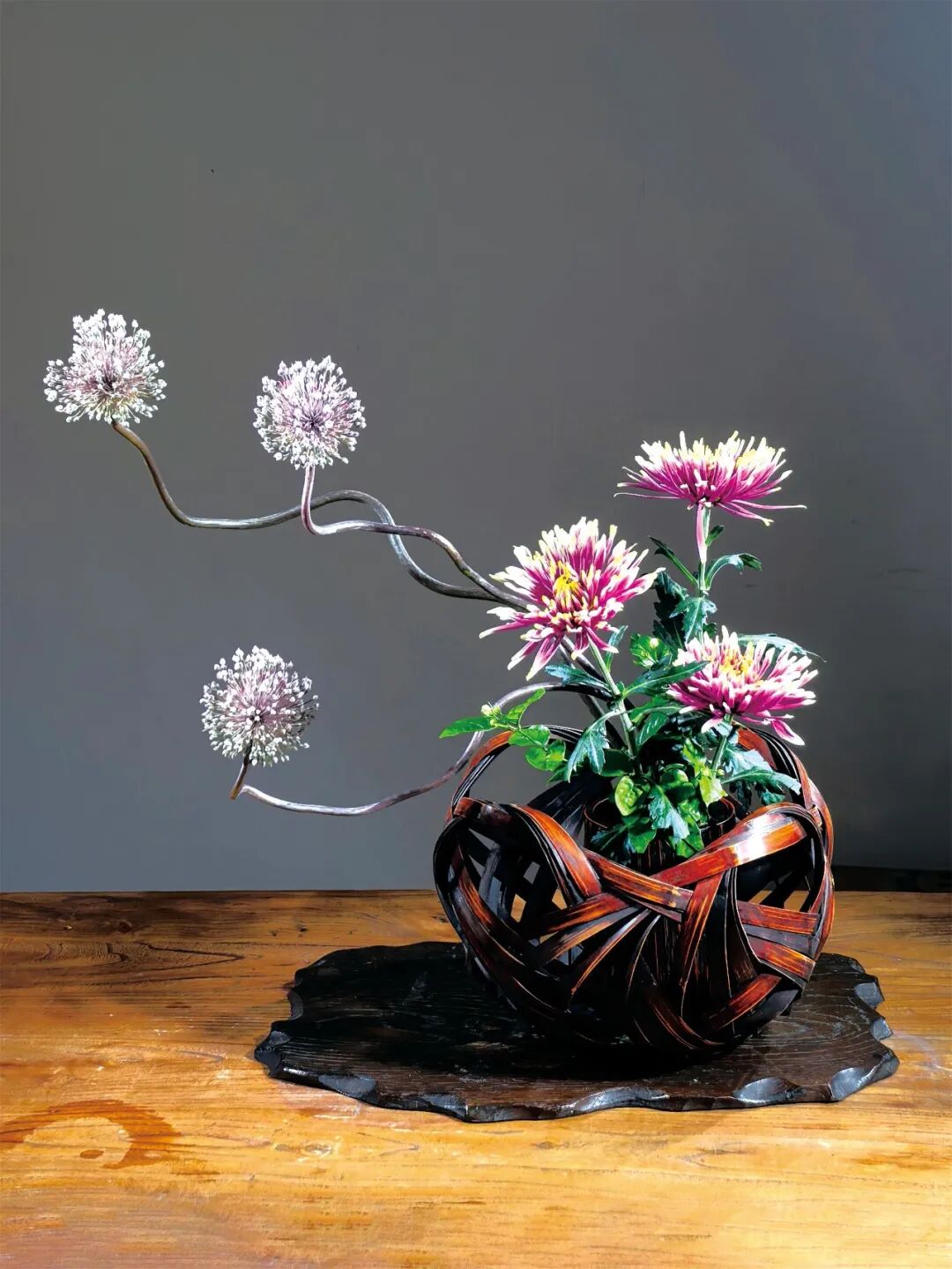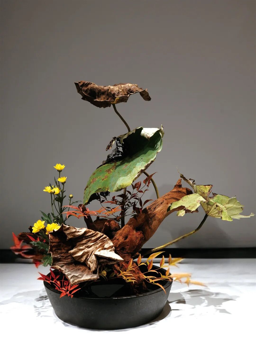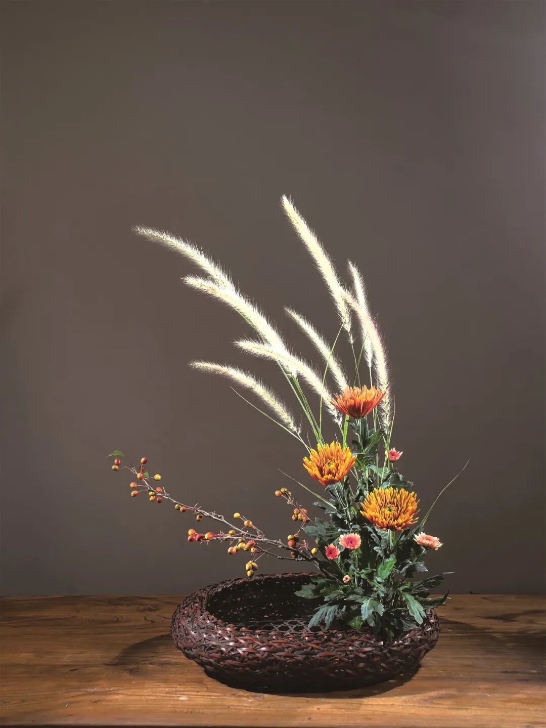 一叶知秋,一花见心。人文花道创始人王国忠,用菊花、松枝、秋叶、果实等材料,通过线条对比和色彩搭配,营造“自然和谐”的东方禅意,展现“浅红淡白间深黄,簇簇新妆阵阵香”的秋日景致。 《幽姿》 花材:弯葱,菊,茉莉 浅紫色的弯葱,姿势曲折有致,安置在竹器左侧,横空而出,高低长短不一。选用色彩和谐的紫色烟花菊与之对应。 《风华再现》 花材:黄菊、松柏、红枫、杜鹃等 多种花材,向四面八方伸展,使作品更具立体感。 《秋晚》 花材:狼尾草、菊、海棠果 狼尾草在轻风中悠扬,菊花晚秋之姿最清,海棠果实橙黄一片,想必此时正是轻松自在。 《虚实相生》 花材:南蛇藤、向日葵、银白槭 轻盈的南蛇藤划破左半边的空间,是属于虚的部分,而篮子中间,向日葵和槭树把实的部分填满,让作品虚实相称。 《听雨》 花材:枯荷、小菊、南天竹、枯木 秋风摧得百花残,枯荷已败虫漏满,雨声打破秋色墨,新芽期待见春漫。 《玩月赏花》 花材:杜鹃枝叶、五针松、菊 仲秋之月,月正圆,红叶满山,邀一盆清水,玩月,赏菊。 《晚容》 花材:芦竹、姜荷花、茉莉花 芦竹似竹而非竹,虽心空亦有节,姜荷花此时已进入尾声,两者相聚秋日时节,展现出彼此的风姿。 《秋色连天》 花材:南蛇藤、菊、银白槭 采用渐变色花材组合,表现秋的色彩饱满。