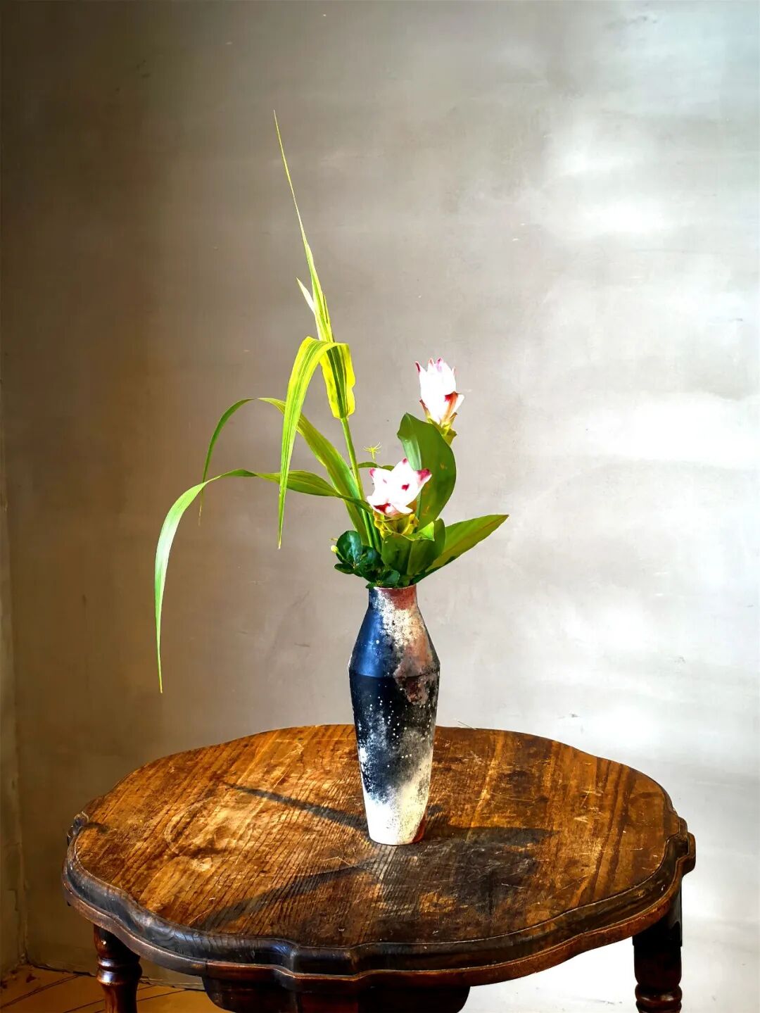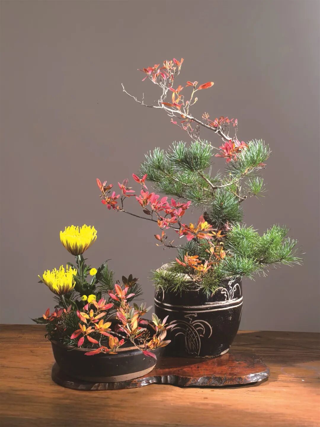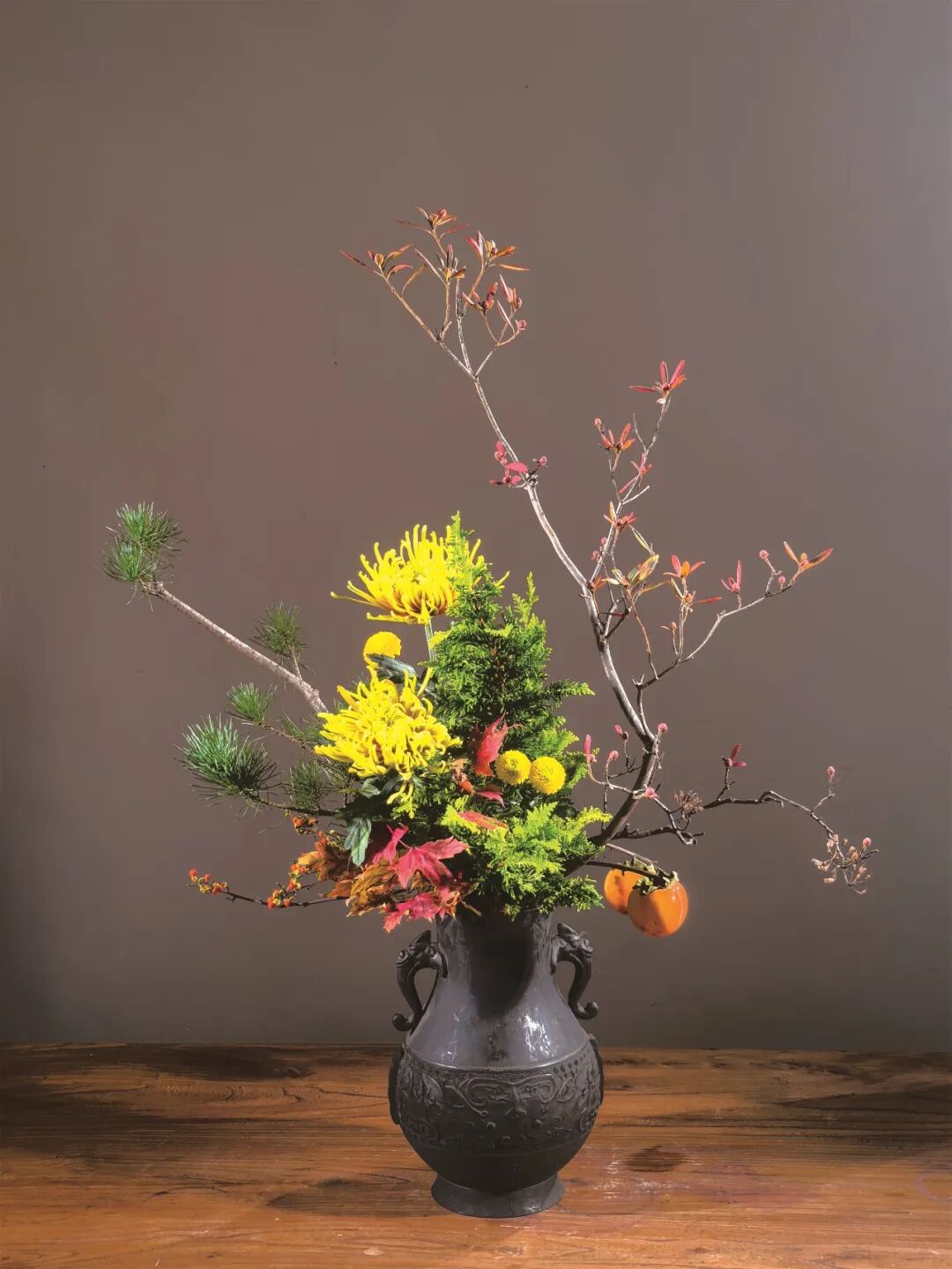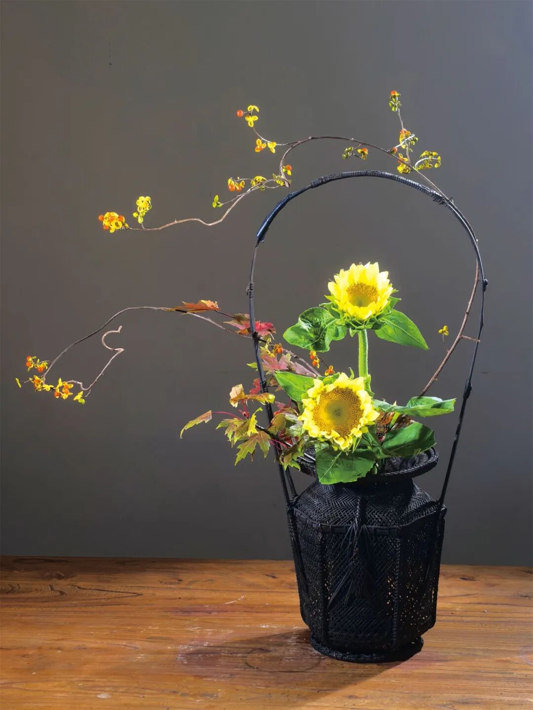 一叶知秋,一花见心。人文花道创始人王国忠,用菊花、松枝、秋叶、果实等材料,通过线条对比和色彩搭配,营造“自然和谐”的东方禅意,展现“浅红淡白间深黄,簇簇新妆阵阵香”的秋日景致。 《幽姿》 花材:弯葱,菊,茉莉 浅紫色的弯葱,姿势曲折有致,安置在竹器左侧,横空而出,高低长短不一。选用色彩和谐的紫色烟花菊与之对应。 《风华再现》 花材:黄菊、松柏、红枫、杜鹃等 多种花材,向四面八方伸展,使作品更具立体感。 《秋晚》 花材:狼尾草、菊、海棠果 狼尾草在轻风中悠扬,菊花晚秋之姿最清,海棠果实橙黄一片,想必此时正是轻松自在。 《虚实相生》 花材:南蛇藤、向日葵、银白槭 轻盈的南蛇藤划破左半边的空间,是属于虚的部分,而篮子中间,向日葵和槭树把实的部分填满,让作品虚实相称。 《听雨》 花材:枯荷、小菊、南天竹、枯木 秋风摧得百花残,枯荷已败虫漏满,雨声打破秋色墨,新芽期待见春漫。 《玩月赏花》 花材:杜鹃枝叶、五针松、菊 仲秋之月,月正圆,红叶满山,邀一盆清水,玩月,赏菊。 《晚容》 花材:芦竹、姜荷花、茉莉花 芦竹似竹而非竹,虽心空亦有节,姜荷花此时已进入尾声,两者相聚秋日时节,展现出彼此的风姿。 《秋色连天》 花材:南蛇藤、菊、银白槭 采用渐变色花材组合,表现秋的色彩饱满。