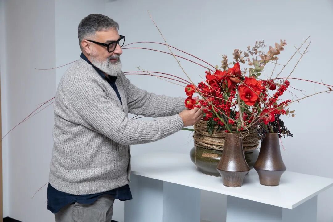西班牙花艺大师丹尼尔为这场雅集注入了截然不同的强音。他的作品宛如一曲用花草演绎的恢宏交响。他运用朱顶红炽烈的红与松枝刚毅的绿进行有力碰撞,再以璀璨金色点缀其间,如同阳光穿透彩绘玻璃洒落的碎片。作品结构饱满,张力十足,每一朵花都昂首挺胸,生命的热力几乎破框而出,是西方花艺毫无保留的热情拥抱。