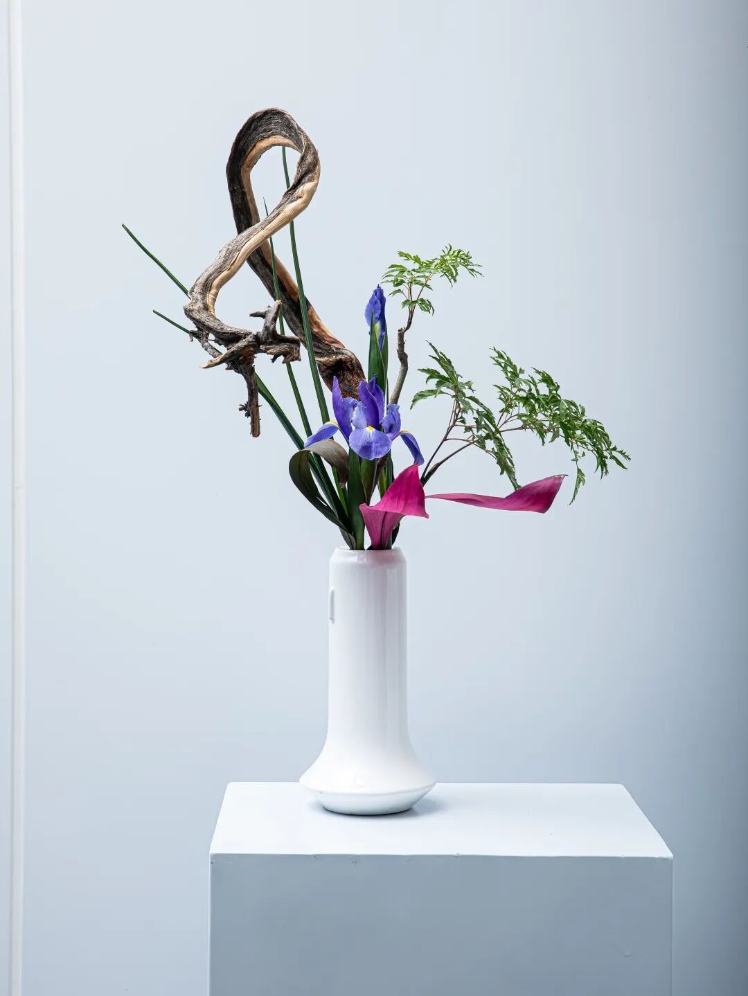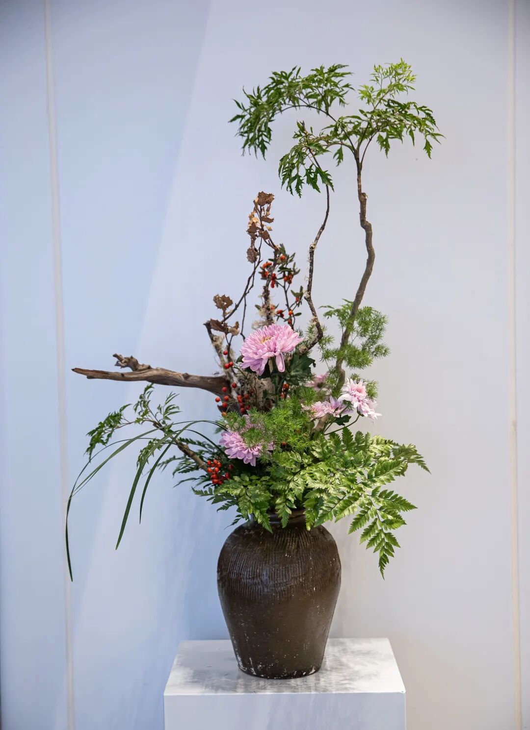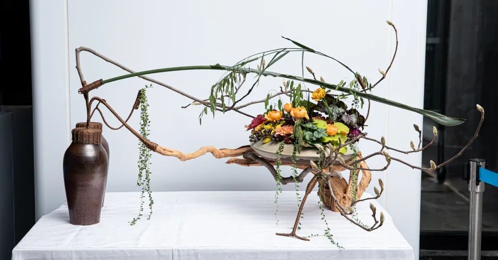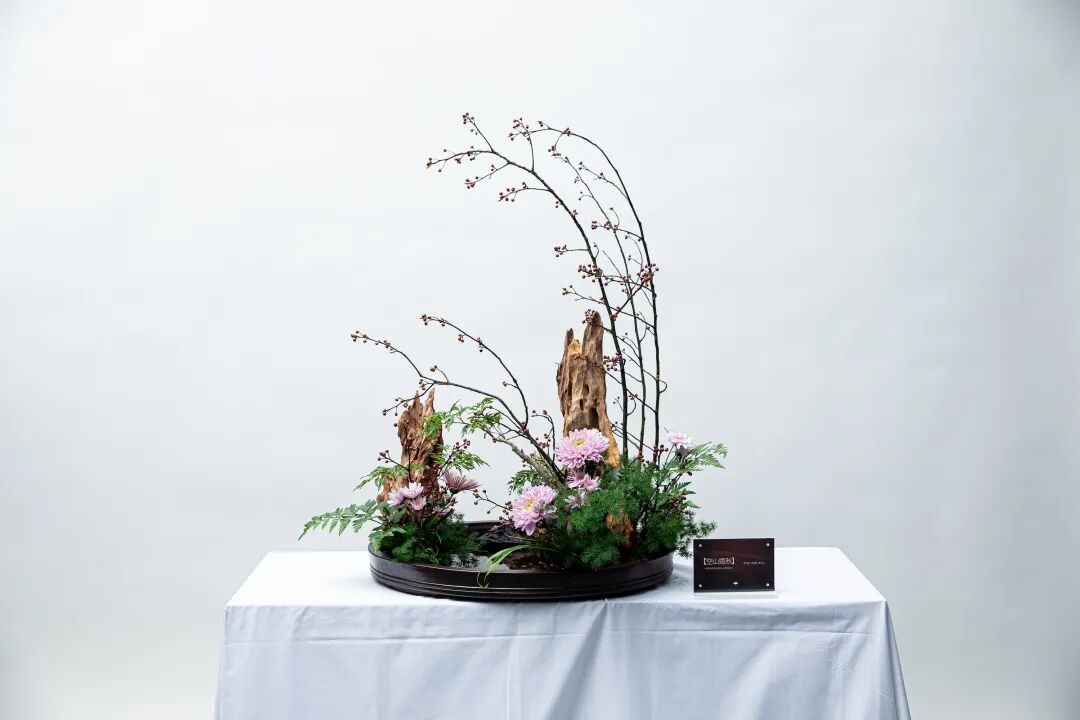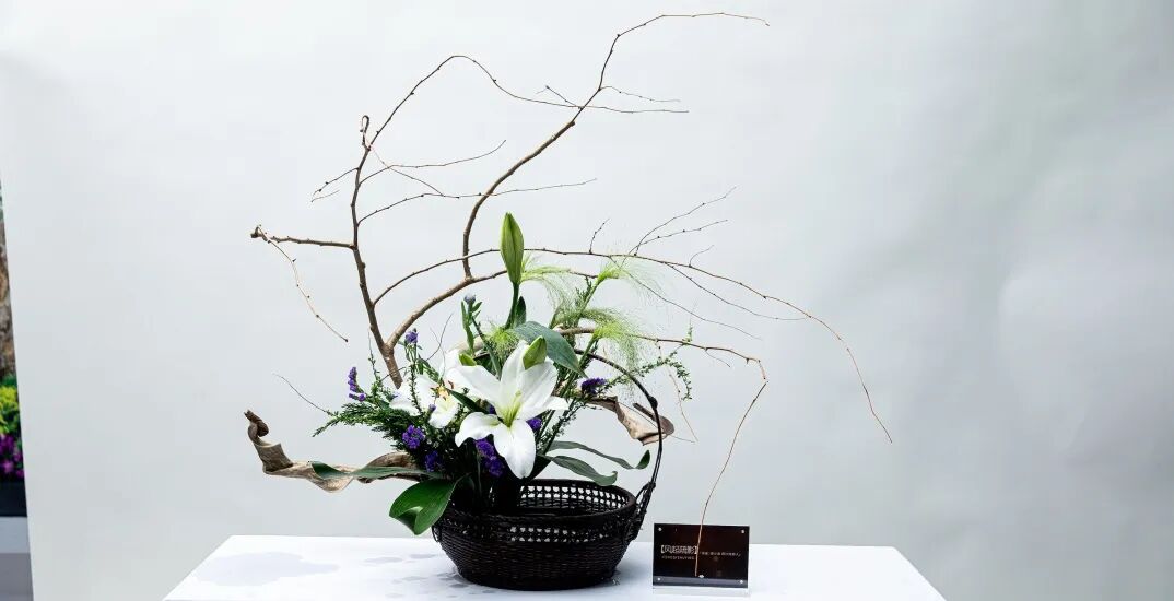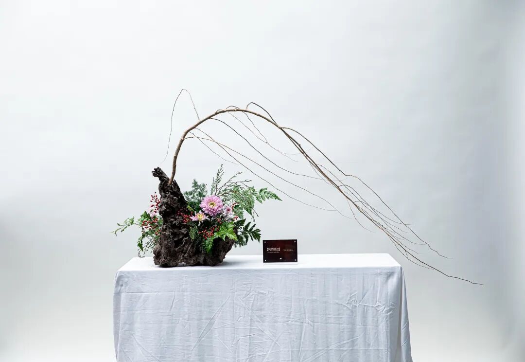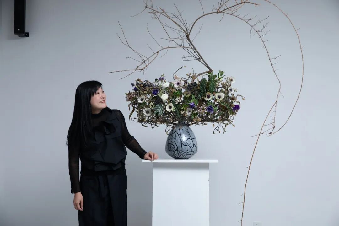 而来自台湾的花艺名师林惠理,则站在东西方美学河流的交汇处。她深谙东方“留白”的玄妙,更能掌控西方“结构”的力量。在她手中,几枝苍褐的玉兰花苞构筑成清癯有力的骨骼,斜探出几枝水墨画般晕染的花枝,旁缀白色与淡紫色的洋桔梗。她引入大叶冬青墨玉似的果实与姿态奇崛的枯枝,让枯槁与鲜妍形成时间维度上的对话——腐朽与新生在此刻达成美的和解。最点睛的是一支大飘枝,飞扬而出,划出优美弧线,让静止的作品有了风的动势与音乐的旋律感。凝视这作品,仿佛看见她从山水画卷中走来,信手拈来天地的片段,眉宇间是与花木心神相交的自在通透。
