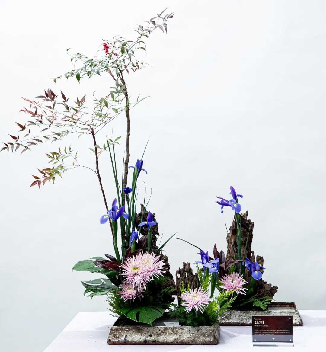 这是一次中西方插花艺术灵魂的深度交融。蔡仲娟以六十六载修为与满腔热忱,创作了“风、花、雪、月”大型框景组合花艺。框景为骨,是世间的规矩;花草为魂,是天地的呼吸。看她以物赋形,以形写意:撷取鸢尾兰数茎,花叶亭亭玉立,仿佛生长在无形的气流里,让人感到“风”的清冽自由。择取将开未开的牡丹,嫣红初透,花瓣舒卷,蓄满春日最鲜嫩饱满的气息,这便是“花”的魂灵。转而,用皴裂树皮堆叠出山势,以点点红梅清冷缀于其间,摹写出“雪”的澄澈与寂然——是峰巅之上凝定未化的那一捧。最后是“月”,她选用喷泉草,穗状花序轻盈如雾,乳白色微光朦胧晕染,恰似一弯新月恬淡悬于墨蓝天幕。