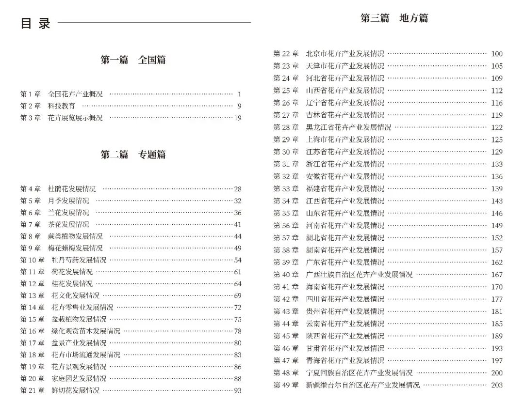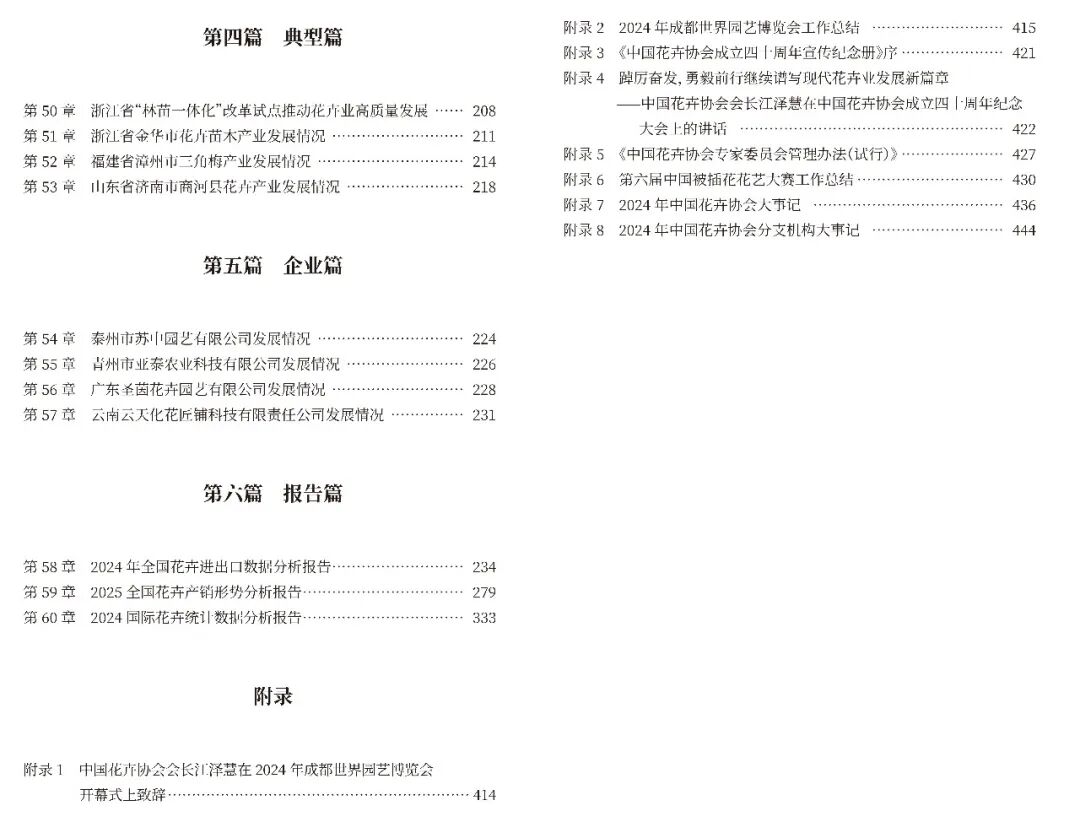 全国篇 概述了2024年我国花卉产业、科技教育以及花卉展览展示情况。 专题篇 共18章,主要从产业特点、主要问题、对策与建议等方面总结2024年中国花卉协会各分支机构所涉及花卉领域及鲜切花发展情况。 地方篇 共28章,主要从主要成绩及经验、主要问题、发展思路与重点等方面总结2024年各省(区、市)花卉产业发展情况。 典型篇 重点介绍了浙江省"林苗一体化"、金华市,福建省漳州市和山东省济南市商河县4个地区2024年相关产业发展情况、主要问题、发展思路与重点等方面的内容。 企业篇 重点介绍了泰州市苏中园艺有限公司、青州市亚泰农业科技有限公司、广东圣茵花卉园艺有限公司和云南云天化花匠铺科技有限责任公司4家单位2024年发展情况、主要特点、生产经营和社会影响等方面的内容。 报告篇 收录了《2024年全国花卉进出口数据分析报告》、《2025全国花卉产销形势分析和报告》和《2024国际花卉统计数据分析报告》。 附录 主要收录了中国花卉协会会长江泽慧在2024年成都世界园艺博览会开幕式上致辞、2024年成都世界园艺博览会工作总结和《中国花卉协会成立四十周年宣传纪念册》序等内容,以及2024年中国花卉协会及各分支机构大事记。 中国花卉协会会员可登录中国花卉协会会员发展与服务系统( http://www.chinahhxh.com/index1.html )资源共享栏目查看全书内容。扫描下方二维码可申请加入中国花卉协会。 校对 | 韩韵 审核 | 晓白 排版 | 孟宇