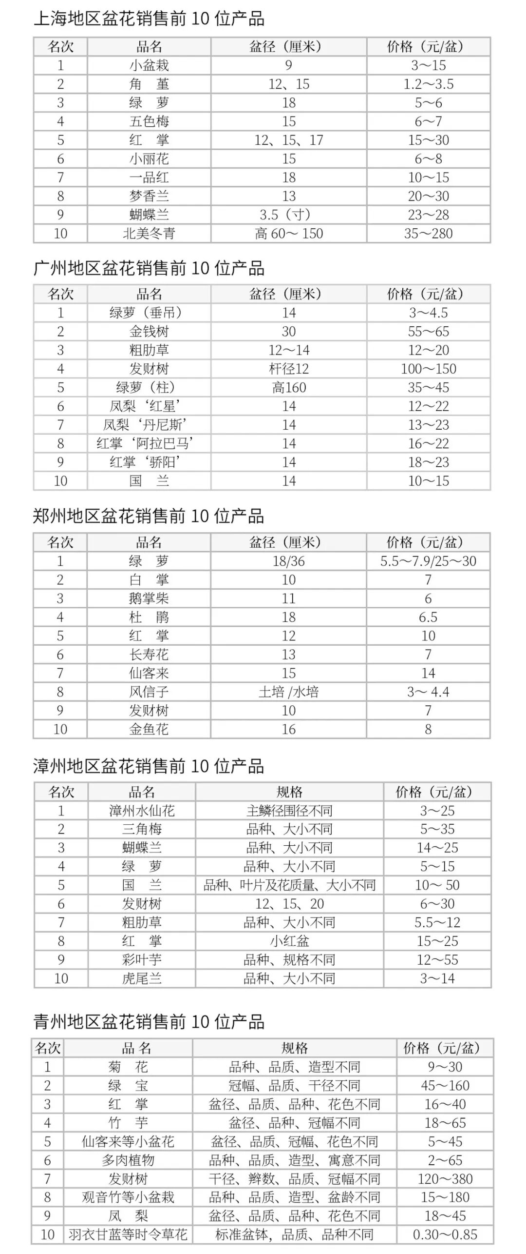 11月,盆花市场开始进入传统销售淡季,用花需求不高,交易行情出现波动。 上海 11月是盆花销售的传统淡季,加上降温不多,换花需求不高,盆花销量明显下降。 在草花中,五色梅、小丽花、角堇等耐寒品类销售相对较好。盆径15厘米的五色梅售价6~7元/盆、小丽花5~6元/盆,角堇3~3.5元/盆。一品红销量较高,但价格不高,为10~15元/盆,环比下降15%左右。 大型绿植销量明显下降,基地在寒潮前进行促销,整体价格环比下降20%。干径6厘米的幸福树160元/盆、绿宝100元/盆。 在开花盆栽中,红掌、蝴蝶兰销量相对较好,价格保持稳定。梦香兰、杂交兰也有一定的销量。13厘米盆径的梦香兰20~30元/盆,杂交兰25~40元,同比下降20%以上。 大花蕙兰、北美冬青、红玉珠等年宵特有产品开始上市。北美冬青上市量同比明显增长,但销量增长不明显,价格同比下降30%,株高80厘米的售价约55元/盆,株高1.2米的约80元/盆。 (上海鲜花港 杨鹏) 广州 11月,盆花整体销售情况不理想。在观叶盆栽中,天南星科植物、发财树、金钱树、竹芋类等货源充足,价格与往年同期相比走低。观花盆栽销售也不乐观,红掌上市品种较多,但价格较往年同期下跌。凤梨优质优价现象明显,品质一般的产品甚至滞销。微型月季、长寿花、大花海棠等开花盆栽陆续上市,但因需求量不大,价格偏低。蝴蝶兰、国兰、杂交兰、春石斛等各类兰花占有一定的市场份额,但销量不大,价格与去年同期相比持平。月初,草本盆花、地被开花植物有一定的销量,价格稳中有升。迷你盆栽、组合盆栽、水培花卉受市场欢迎,价格平稳。(广东省农业科学院环境园艺研究所 王代容) 郑州 11月正值盆花市场淡季,市场交易情况不尽如人意。因今年农历春节较晚,与往年相比,年宵花品类仅少量进场,预计从下月中旬起将陆续上市。小盆栽价格呈波动上涨态势,虽整体销量欠佳,但受基地加温费、运费等成本增加,价格上涨。 观叶类 盆径18厘米绿萝售价5.5~7.9元/盆,环比上涨7.2%;盆径36厘米绿萝售价25~30元/盆,环比保持稳定。盆径11厘米鹅掌柴(招财树)均价6元/盆,环比保持稳定。盆径10厘米发财树均价7元/盆,环比上涨17%。 观花类 盆径10厘米白掌均价7元/盆,环比上涨17%。盆径18厘米杜鹃花均价6.5元/盆,环比保持稳定。盆径13厘米红掌均价10元/盆,环比保持稳定。盆径13厘米长寿花均价7元/盆,环比保持稳定。盆径16厘米金鱼花均价8元/盆,环比上涨7%。风信子大量上市,土培均价3元/球,同比下降3%;水培带瓶均价4.4元/套,同比下降4%。仙客来大量上市,盆径15厘米的均价14元/盆。 (河南陈砦花卉双桥基地 徐一诺) 漳州 11月,漳州温度适宜,年宵花逐渐上市,花卉交易市场人气有所提高,各类盆花销售形势向好。 漳州水仙花 截至本月,总产量约40%的花球已被收购,球径25.5厘米以上的特级水仙花球收购价25元/粒,球径24~25.5厘米的一级水仙花球8~10元/粒,球径22~24厘米的二级水仙花球5元/粒,球径18~22厘米的三级水仙花球3元/粒,球径16~18厘米的四级水仙花球1.3元/粒。 观叶盆栽 上市盆花种类明显增多,准备迎接年宵旺季。三角梅进入盛花期,销售旺季全面开启。线下花卉市场、线上电商平台交易量较淡季增长30%以上。小红盆单色花6~8元/盆,租摆款10元/盆,六角盆12~14元/盆。粗肋草‘吉利红’10~12元/盆,红掌7~18元/盆。高60~70厘米4株组合的虎尾兰6~6.5元/盆。五辫发财树8~9元/盆,‘姬虎耳’等迷你小盆栽3~15元/盆,不同品种彩叶芋批发价12~120元/盆,0.4加仑盆绿宝16元/盆。蔓绿绒因品种、规格不同,价格在15~300元/盆不等。 兰花 市场销售以春兰、建兰、墨兰为主,价格、销量波动不大。墨兰‘红美人’25元/盆,‘金太阳’30元/苗。春兰‘宋梅’‘余蝴蝶’15元/盆,‘花开富贵’15~25元/盆。蝴蝶兰陆续进入年宵花准备阶段,价格稳定,中小花型14~20元/株,大花型25元/株。 (福建漳州市花卉协会 林婵娟) 青州 11月,在桂花展、“双十一”、青州花卉博览交易会花卉销售翘尾的影响和拉动下,市场内花卉销售量价环比上涨15%左右。仙客来、凤梨、菊花、红掌、蝴蝶兰、一品红等盆花量价环比上涨10%,绿宝、竹芋、多肉植物、发财树、龟背竹、碧玉、彩叶芋、蕨类植物、白掌等盆花量价环比上涨8%左右,羽衣甘蓝等时令草花开始上市,价格同比下跌15%~20%。 观叶类 干径6~15厘米的绿宝45~160元/盆。盆径15~30厘米的竹芋18~65元/盆。盆径5~20厘米的多肉植物2~65元/盆。干径8~15厘米、株高1.5~2.5米的发财树(含三辫、五辫、盆景类)120~380元/盆。观音竹、彩叶芋、蕨类植物、苔藓类、白掌等小盆栽15~180元/盆。矾根、碧玉、袖珍椰子等10~25元/盆。干径10~30厘米的幸福树160~520元/盆。绿萝10~75元/盆,龙血树28~320元/盆,金钱树40~130元/盆。君子兰、国兰、龟背竹、金钻、米兰、清香木、平安树、散尾葵、夏威夷椰子、富贵竹、佛手盆景、桂花盆景、三角梅盆景、黄杨盆景、石榴盆景、罗汉松盆景、山水盆景等盆花12~550元/盆(苗)。 观花类 盆径12~19厘米的红掌16~40元/盆,凤梨18~45元/盆,蝴蝶兰15~35元/株,盆菊9~30元/盆。仙客来、彩色马蹄莲、大丽花、茉莉花、丽格海棠、长寿花、蟹爪兰等小盆花10~45元/盆。羽衣甘蓝等时令草花装车价0.30~0.85元/盆。 (青州市花卉产业发展服务中心 杨庆利 吕洪伟 王湘功) 台北 11月,盆花到货量42.7万余盆,环比减少2.7%;交易量42.2万余盆,环比减少2.8%;均价102元/盆,环比增长3%。上旬因无