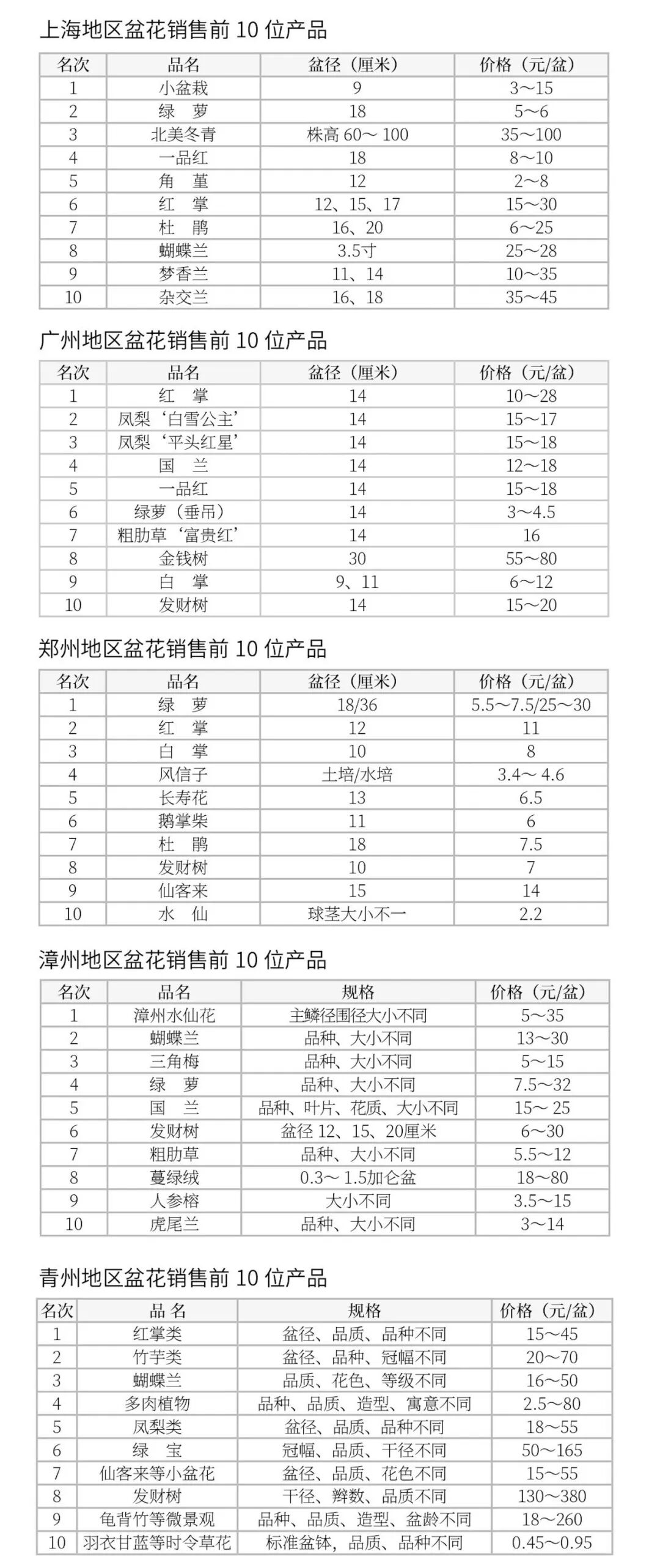 随着年宵花陆续上市,部分地区盆花市场开始活跃,但整体交易还较平淡。 上海 由于马年春节较晚,12月年宵行情并未启动,市场交易整体较淡。作为本月主打产品,一品红销量一般,即使后期价格降至8~10元/盆,促销效果仍一般,部分基地仍有剩货。 草花上市品种不多,以角堇、鼠尾草、天竺葵等耐寒品种为主,销售量价均处于低位。 北美冬青销量较大,但由于上市量大,价格较往年同期明显下降。株高60厘米的售价35~50元/盆,高90厘米的售价79~100元/盆。飘枝造型较受欢迎,价格在300元/盆以上。 各类兰花大量上市,除蝴蝶兰、大花蕙兰外,梦香兰、杂交兰销量也较大。梦香兰价格同比下降20%,盆径11厘米、5~9支花箭的售价16~20元/盆,盆径14厘米、15支花箭的售价约35元/盆,其线上销量也不错。杂交兰中,‘小神童’‘韩国小姐’和白玉香兰等销售较好,售价35~45元/盆。 佛手较受市场追捧,售价80~100元/盆,同比上涨约50%。红玉珠、高山杜鹃等高端年宵花产品销量萎缩。 (上海鲜花港 杨鹏) 广州 12月,观叶盆栽中,除发财树、金钱树、彩叶粗肋草等销量较大外,其他种类销量不高,有的甚至处于滞销状态。观花盆栽陆续上市,种类丰富,且有一定销量。红掌、凤梨上市品种越来越多,优质优价态势明显。新几内亚凤仙、丽格海棠、蟹爪兰、微型月季、长寿花、西洋杜鹃、大花蕙兰、蝴蝶兰、杂交兰、国兰等有一定销量,但价格不高。木本观花植物如山茶花、桂花、簕杜鹃等盆栽价格稳中有升。草本盆花、观赏草、开花灌木等用于景观营造,销量不错。造型盆栽、组合盆栽占有一定市场份额,受到消费者欢迎。 (广东省农业科学院环境园艺研究所 王代容) 郑州 12月气温持续走低,基地保温费与运费等成本攀升,小盆栽类价格涨幅尤为明显。中旬开始,年宵花相继上市,蝴蝶兰、大花蕙兰、仙客来、君子兰、水仙、风信子等常见品种备货充裕。受产地电商收购、直播代销以及当地农业合作社集中收售控价等举措影响,南方年桔、水仙、垂丝茉莉、造型杜鹃、富贵籽等价格出现波动,给实体店带来较大冲击。本月销售仍以开花类小盆栽为主,预计下月年宵花销量将提升。 观叶类 盆径18厘米绿萝售价5.5~7.5元/盆,环比下降3%;盆径36厘米绿萝售价25~30元/盆,环比保持稳定。盆径11厘米鹅掌柴(招财树)均价6元/盆,环比保持稳定。盆径10厘米发财树均价7元/盆,环比保持稳定。 观花类 盆径12厘米红掌均价11元/盆,环比上涨10%。盆径10厘米白掌均价8元/盆,环比上涨14.3%。风信子土培均价3.4元/球,环比上涨13.3%;水培带瓶均价4.6元/套,环比上涨4.5%。盆径13厘米长寿花均价6.5元/盆,环比下降7.1%。盆径18厘米杜鹃花均价7.5元/盆,环比上涨15.4%。盆径15厘米仙客来均价14元/盆,环比保持稳定。水仙通常在春节前60天左右大量上市,本月均价2.2元/球,价格与往年持平,但球茎尺寸整体偏小。 (河南陈砦花卉双桥基地 徐一诺) 漳州 12月,洋兰、国兰、三角梅、水仙花等年宵花集中上市,在电商平台促销加持下,依托线上渠道辐射能力与产业集聚规模优势,驱动整体市场扩容,销量呈现上升趋势。 漳州水仙花 水仙花球已完成收购,特级水仙花球25元/粒,一级水仙花球8~10元/粒,二级水仙花球5元/粒,三级水仙花球3元/粒,四级水仙花球1.3元/粒。水培3号组盆20~35元/盆。 观叶观花盆栽 上市盆花种类明显增多,品种丰富。受线上商家直播带货、工程绿化及租摆需求,三角梅开花株供不应求,小红盆单色花6~8元/盆,租摆款10元/盆,六角盆12~14元/盆。0.5加仑盆粗肋草11~20元/盆。红掌7~18元/盆。高60~70厘米、4株组盆虎尾兰6~6.5元/盆。五辫发财树8~9元/盆。迷你小盆栽如‘姬虎耳’‘内门竹’等价格在3~15元/盆之间。0.5加仑盆彩叶芋批发价22~30元/盆,绿宝16元/盆。蔓绿绒因品种、规格不同价格在15~128元/盆不等,相差较大。 兰花 因是销售的相对旺季,叠加电商平台活动多,销量较上月有所增长。从品类看,大众品种、春兰“老八种”价格稳定,如建兰‘富山奇蝶’约18元/盆,‘秋月’‘云卉’等价格维持在20~25元/盆之间,春兰‘宋梅’25元/盆,墨兰‘企黑’15元/盆。蝴蝶兰3.5寸盆开花株22~30元/株,2.8~3.0寸盆的中小花13~20元/株。 (福建漳州市花卉协会 林婵娟) 青州 12月,在年宵嘉年华加持下,市场内花卉销售线上线下同“热”,量价环比上涨10%左右。红掌、蝴蝶兰、凤梨、仙客来、小丽花、长寿花、丽格海棠、一品红、蟹爪兰、国兰、君子兰、三角梅、北美冬青等盆花量价环比上涨15%左右。竹芋、多肉类、彩叶芋、绿宝、龙血树、发财树、观音竹、龟背竹、白掌等盆花量价环比上涨10%左右。彩色马蹄莲、水仙、百合、朱顶红、风信子等球根花卉陆续上市,价格同比上涨5%~10%。羽衣甘蓝等时令草花价格环比上涨10%~15%。 观叶类 盆径15~30厘米竹芋20~70元/盆,盆径5~20厘米多肉2.5~80元/盆。干径6~15厘米绿宝50~165元/盆。干径8~15厘米、株高1.5~2.5米发财树(含三辫、五辫、盆景类)130~380元/盆。龟背竹、观音竹、万年青、富贵籽、彩叶芋、北美冬青、蕨类、苔藓类等18~260元/盆。干径10~30厘米幸福树150~530元/盆。矾根、碧玉、袖珍椰子、白掌等小绿植10~25元/盆。龙血树28~330元/盆,金钱树45~120元/盆。君子兰、国兰、文心兰、垂丝茉莉、巴西木、金钻、清香木、平安树、虎皮兰、夏威夷椰子、万年青、佛手盆景、海棠盆景、黄杨盆景、罗汉松盆景、赤楠盆