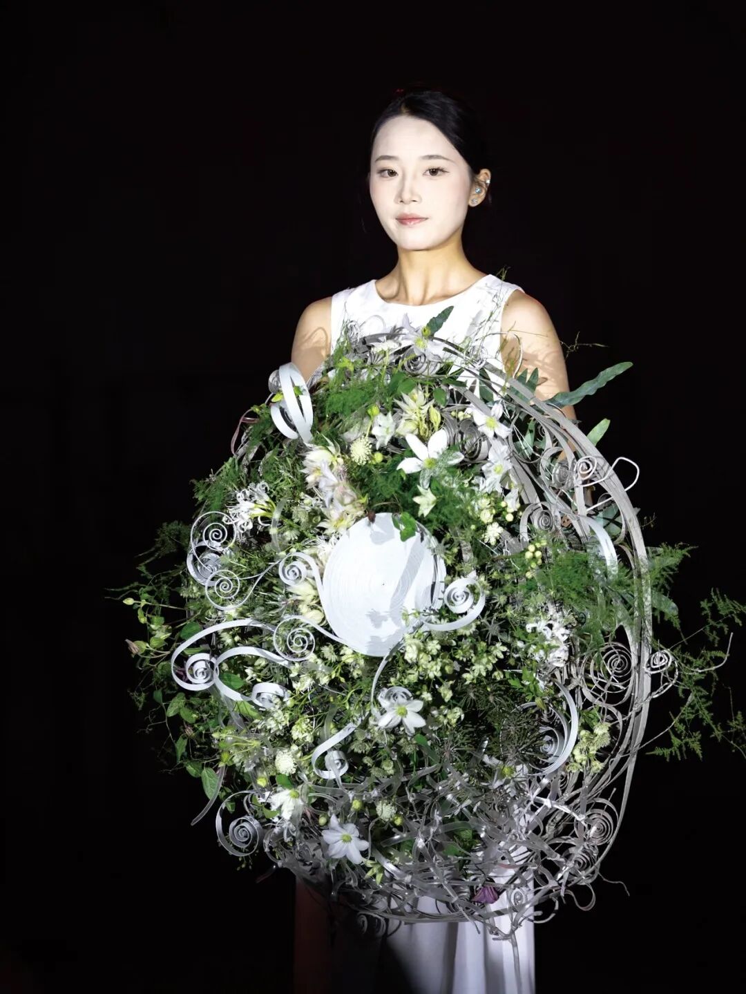 这款圆形手捧花体量较大,舞台效果很好。因选择白绿色系花材,上花时中间聚拢,四周轻盈,故没有沉重之感。