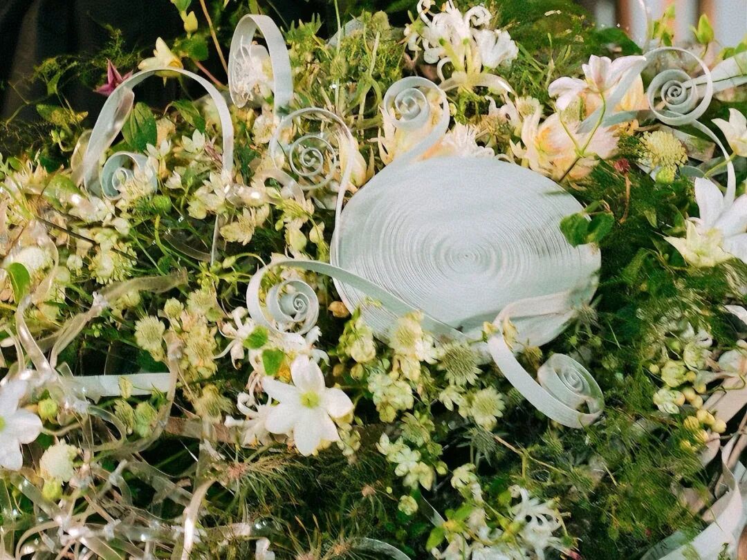 这是一个“匍匐”在一段圆木上的花艺作品。常规的瓶器被一段树皮粗糙、年轮可见的圆木所替代。各种线条、花材安置于其上,表现出枯与荣和生命的交替感。