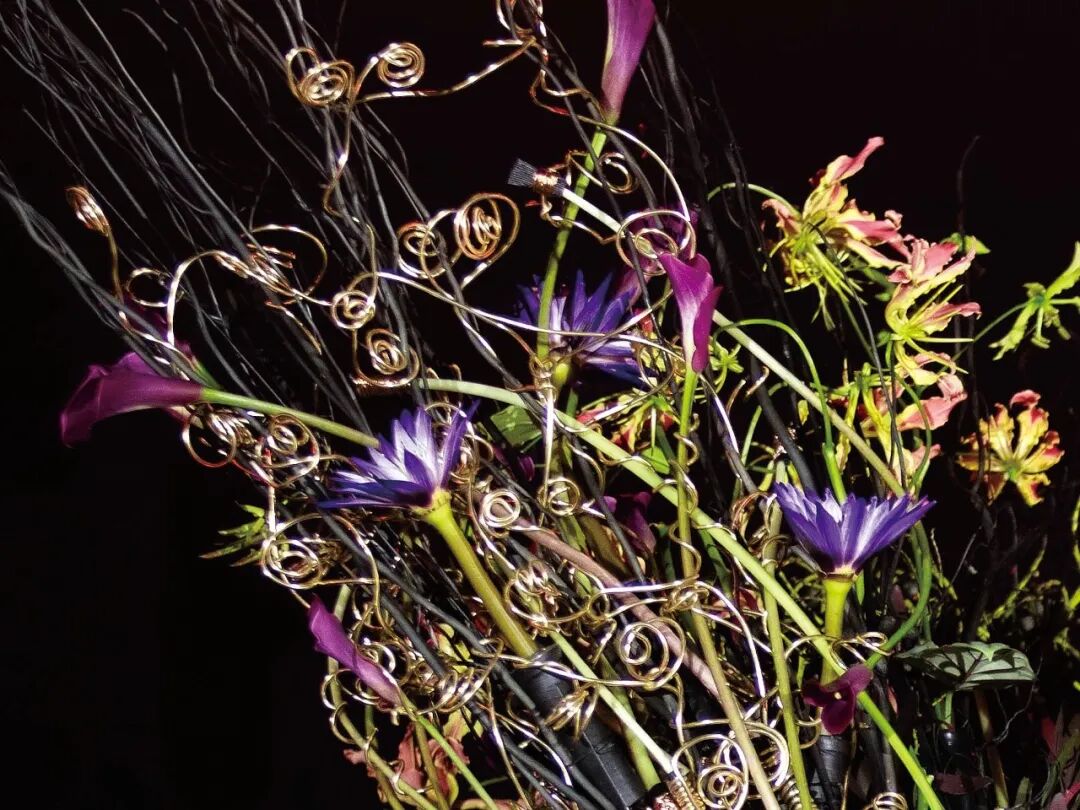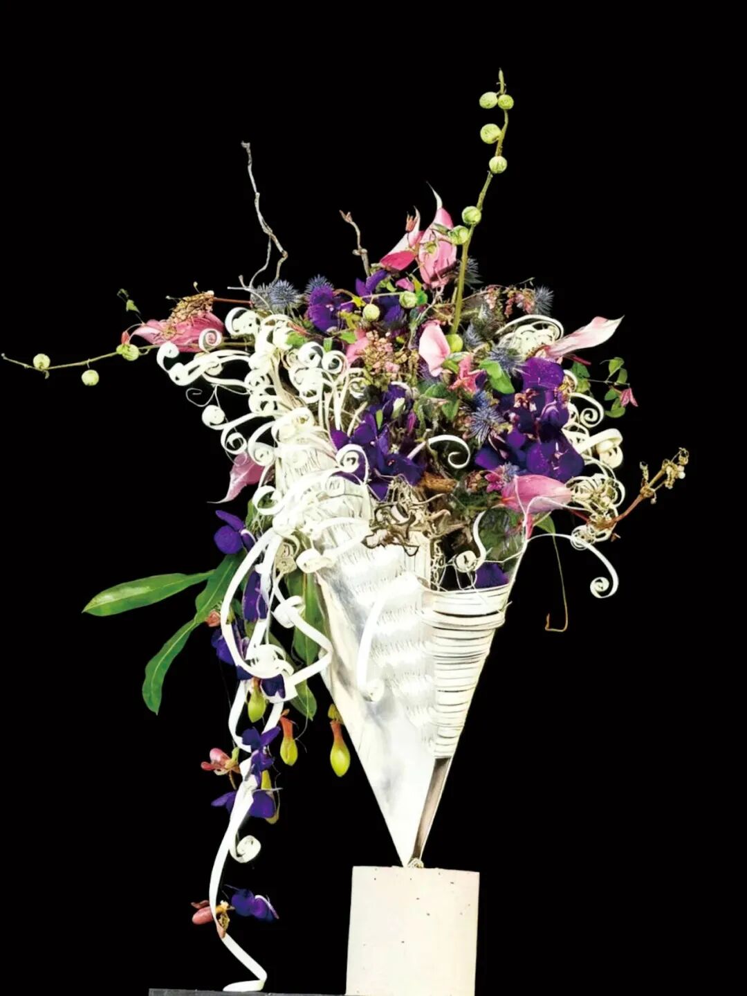 这个作品展示的是不平衡感带来的视觉冲击。1米多高白色三角型“花器”立锥于一个小小的支点上,花器如张开的口袋,绚丽的花叶从中“生”出。造型惊艳,手法细节同样耐看。